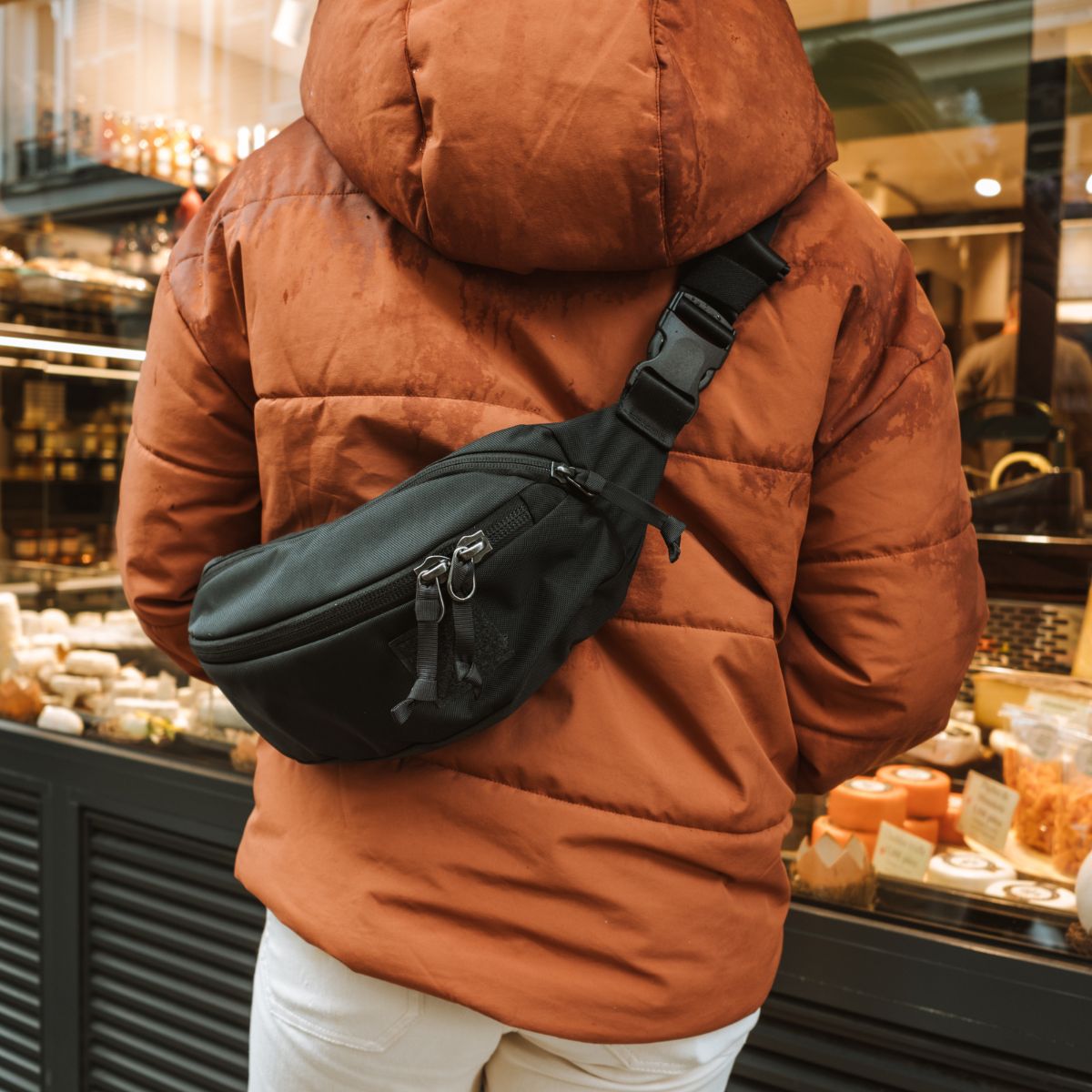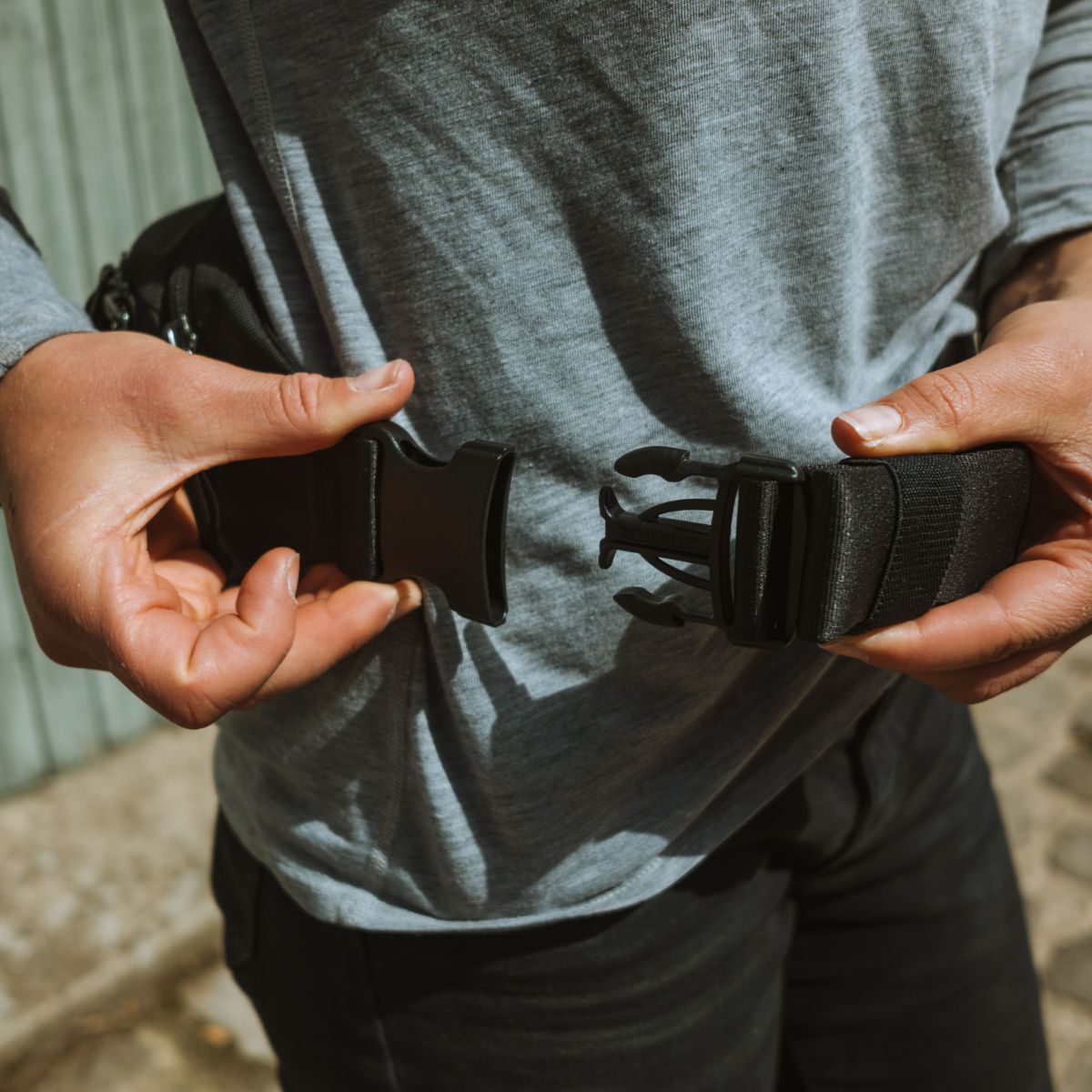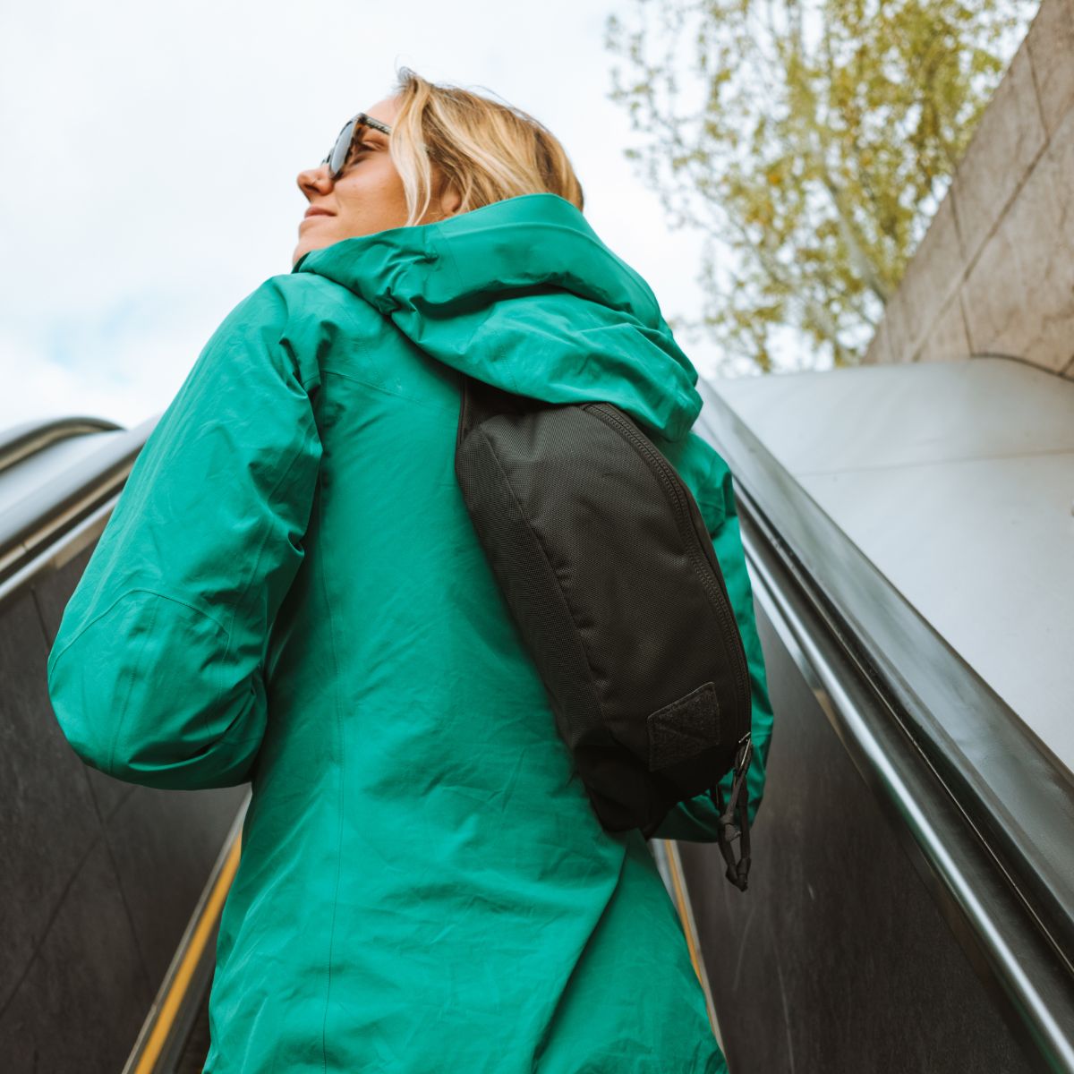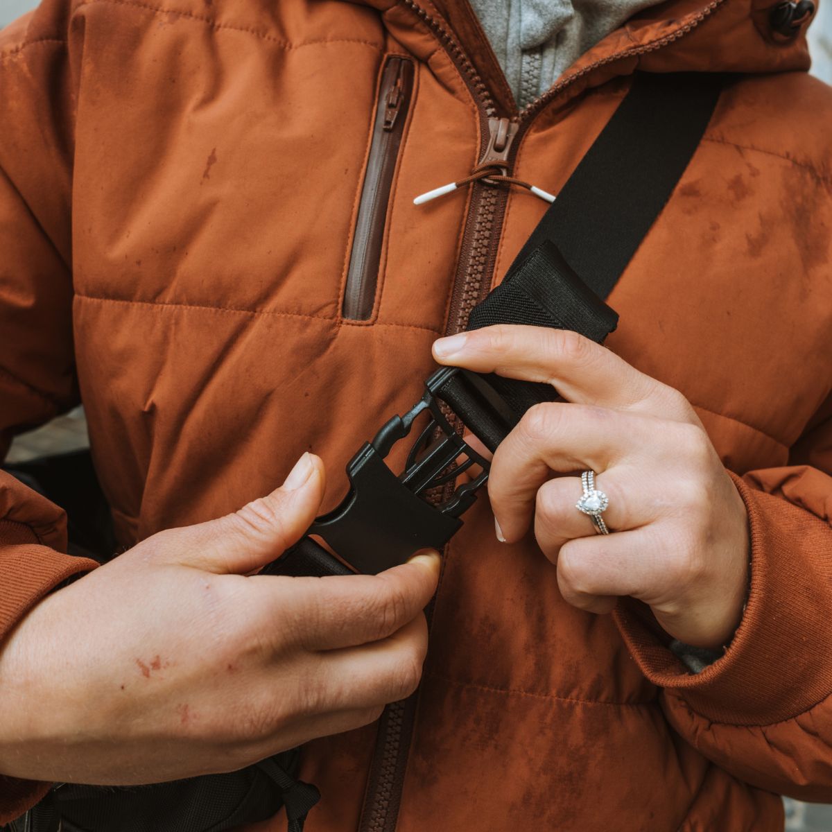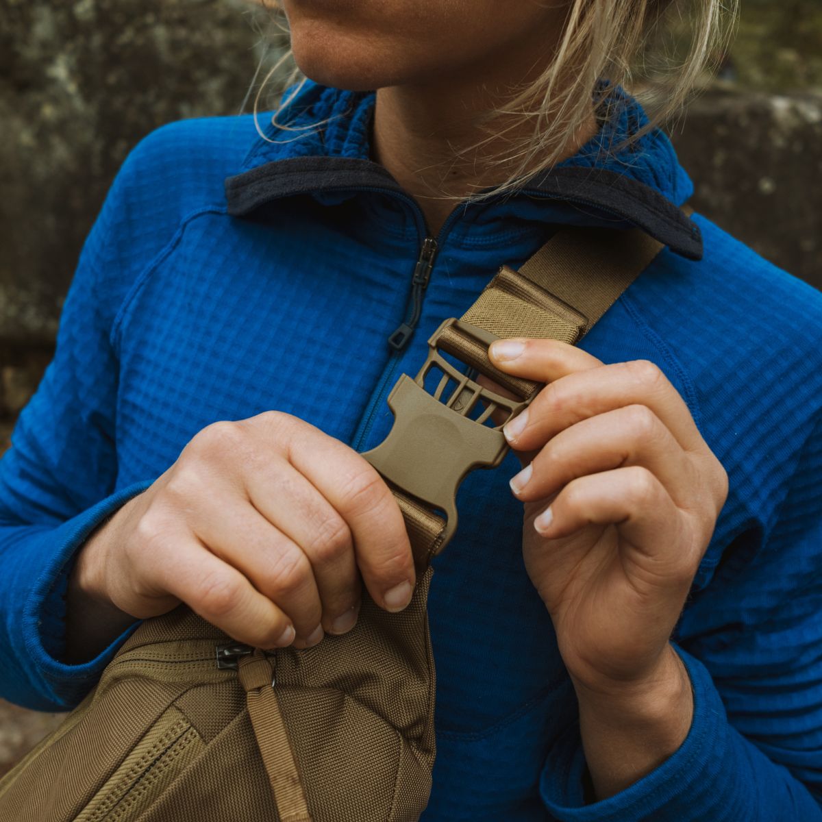 We updated the buckle and strap configuration to improve its function and maintain its streamlined aesthetics. The buckle is now on the sling’s side and includes a sleek strap keeper.