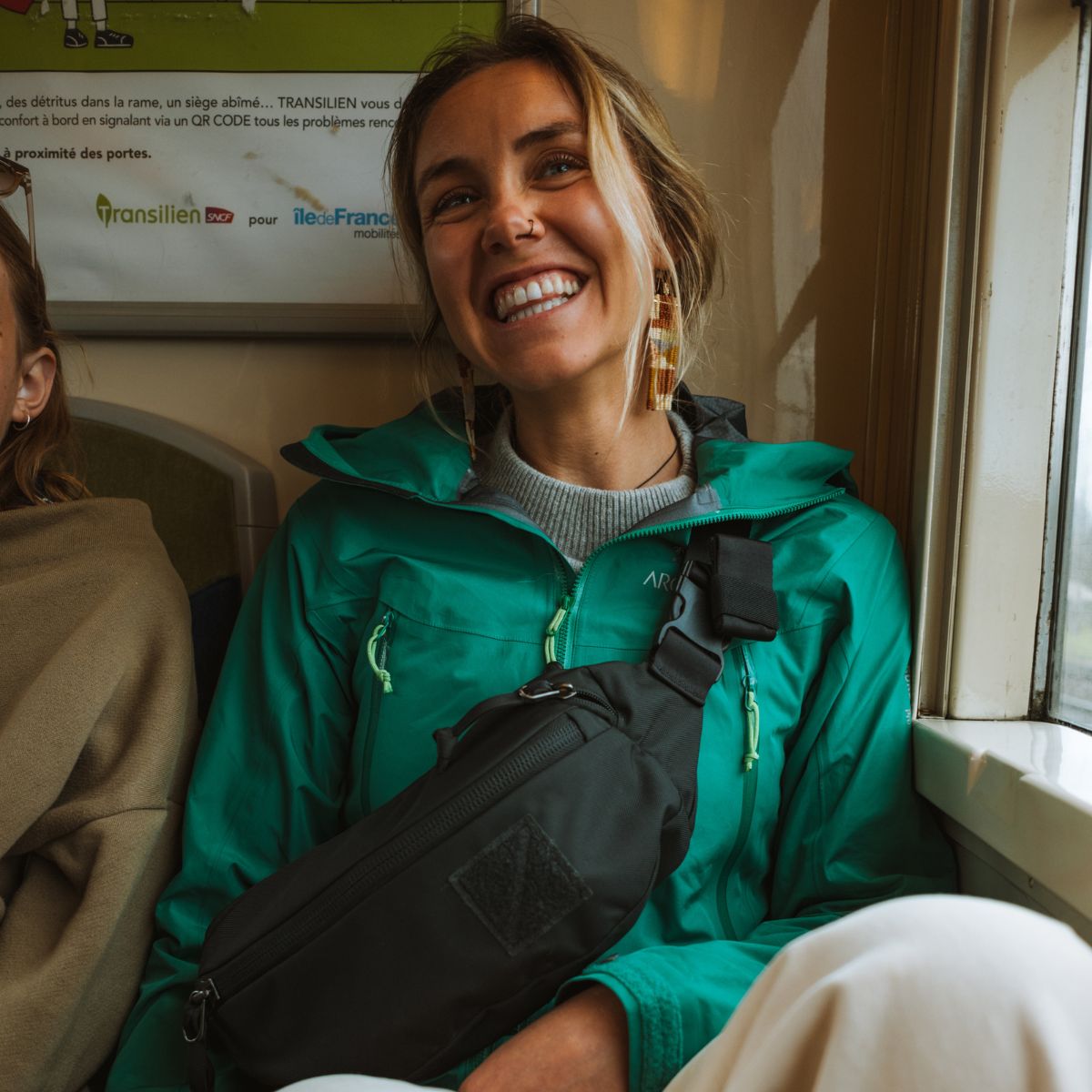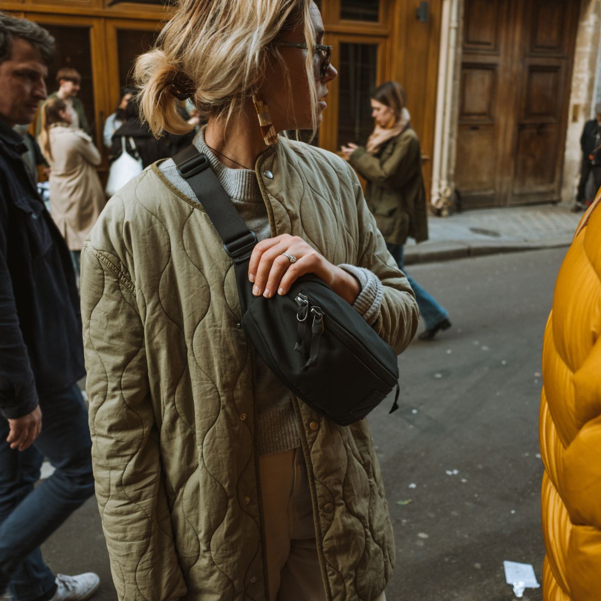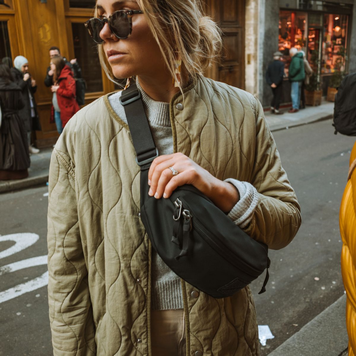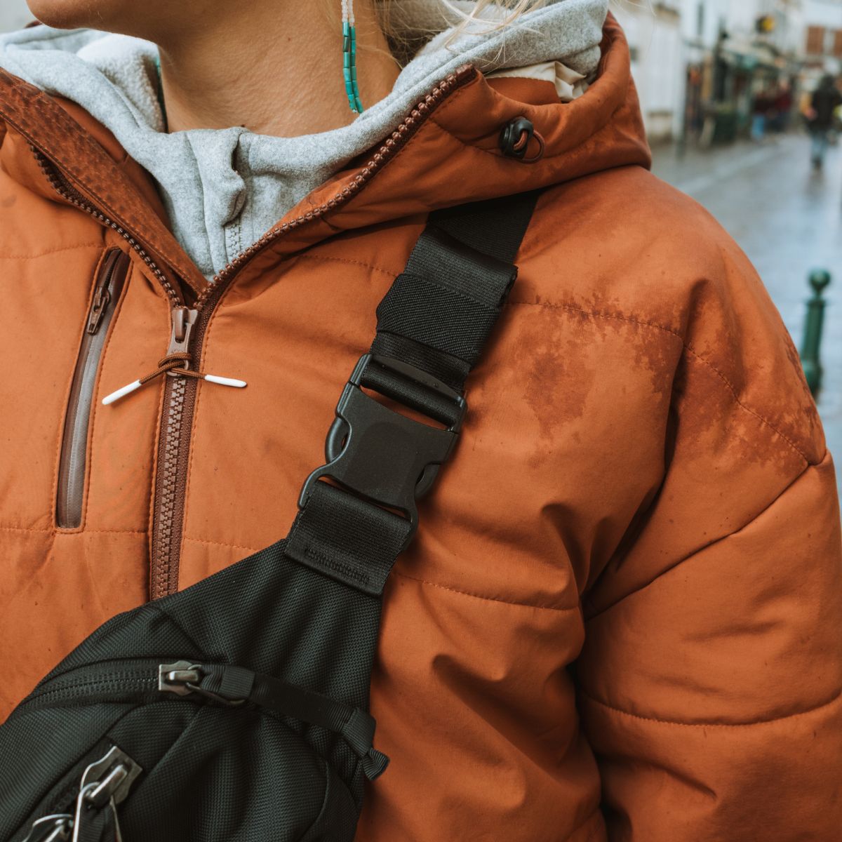 We updated the buckle and strap configuration to improve its function and maintain its streamlined aesthetics. The buckle is now on the sling’s side and includes a sleek strap keeper.