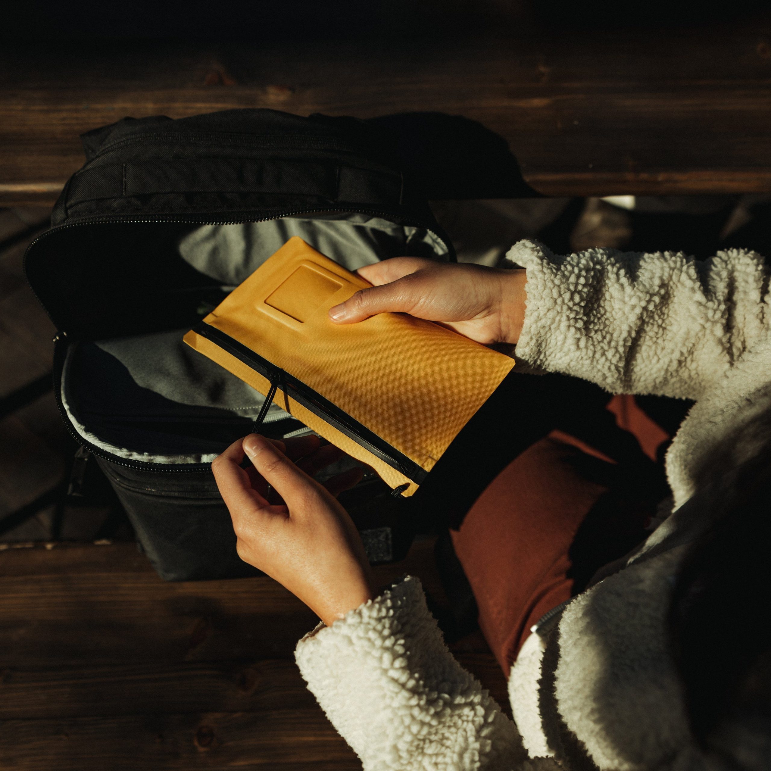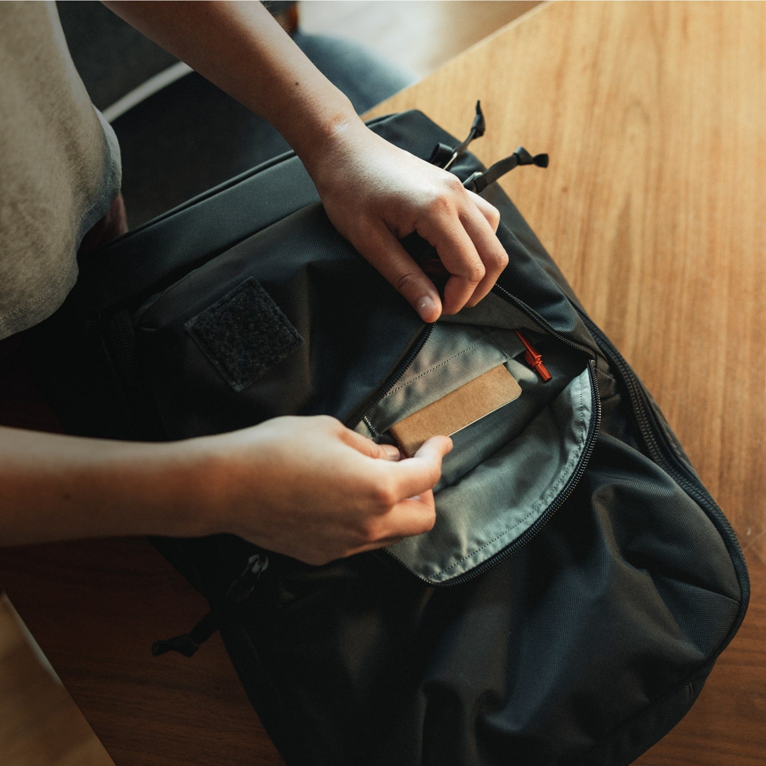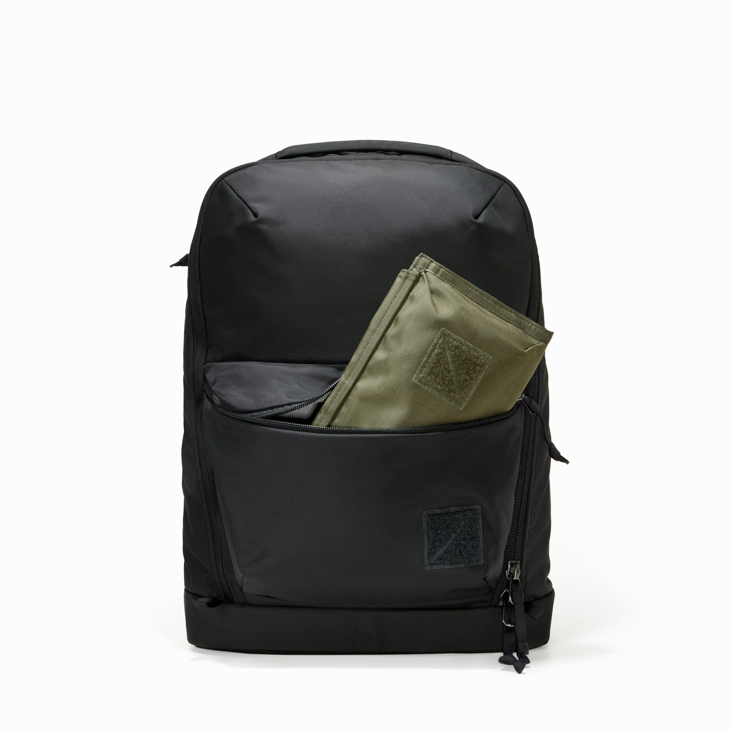 We patterned the front admin pocket with independent volume. It is large enough to fit a CAP1. packable jacket. or notebook – even if the main cavity is stuffed. Our admin pocket also contains 2 drop-in pockets sized for phones or passports. and 1 drop-in slot for a pen or knife. Key leash included.