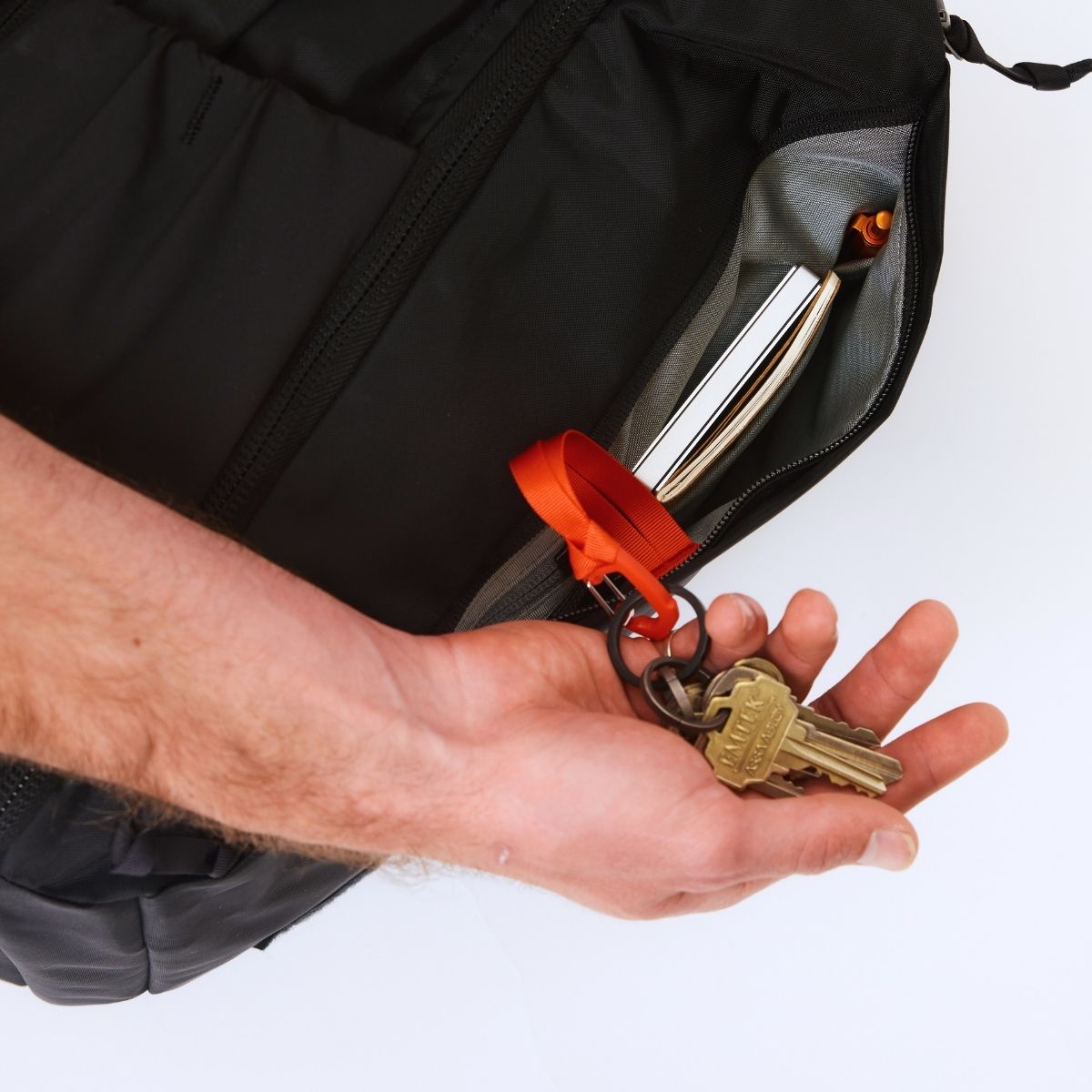- Side access front pocket includes key leash. one zipper pocket. and two EDC drop in pockets.