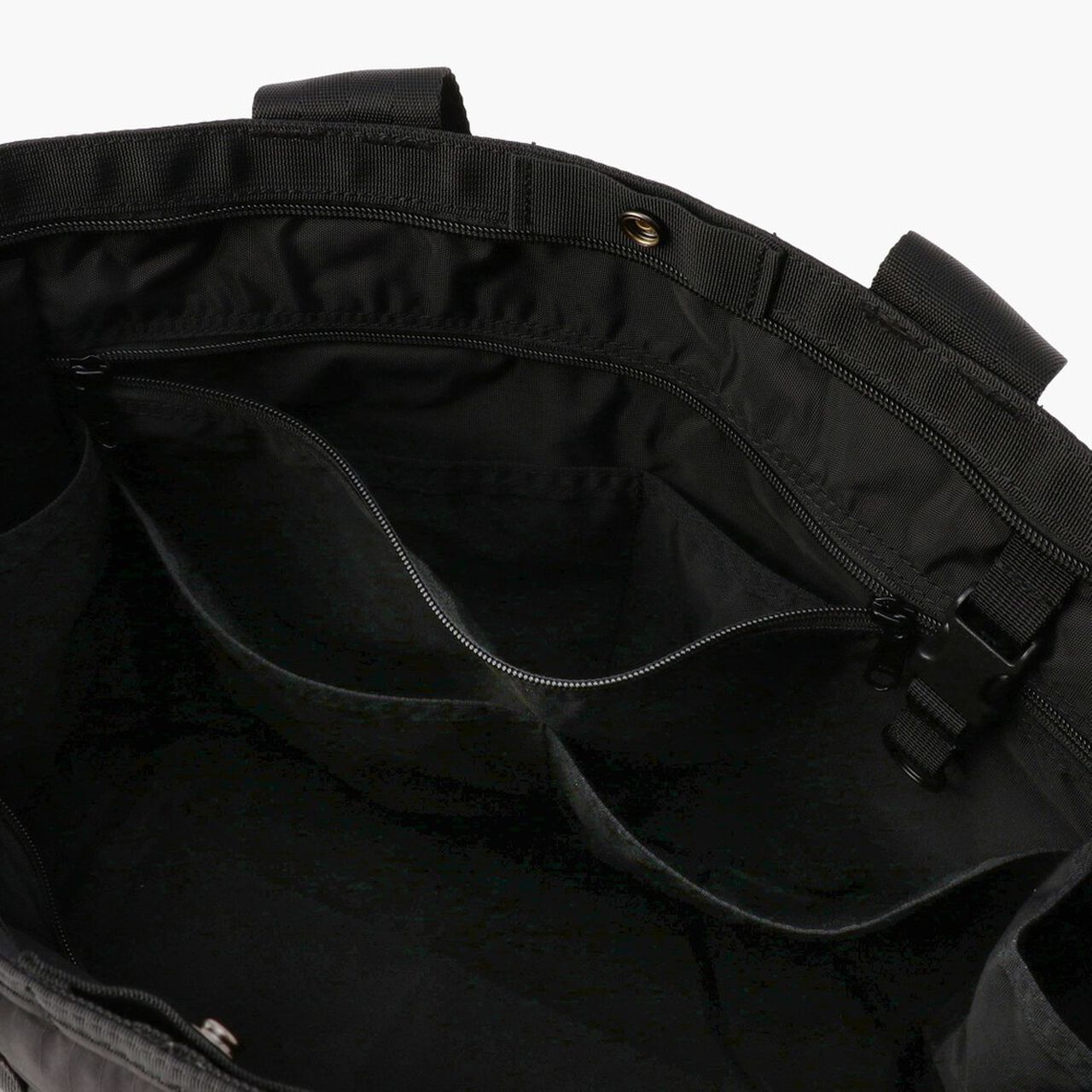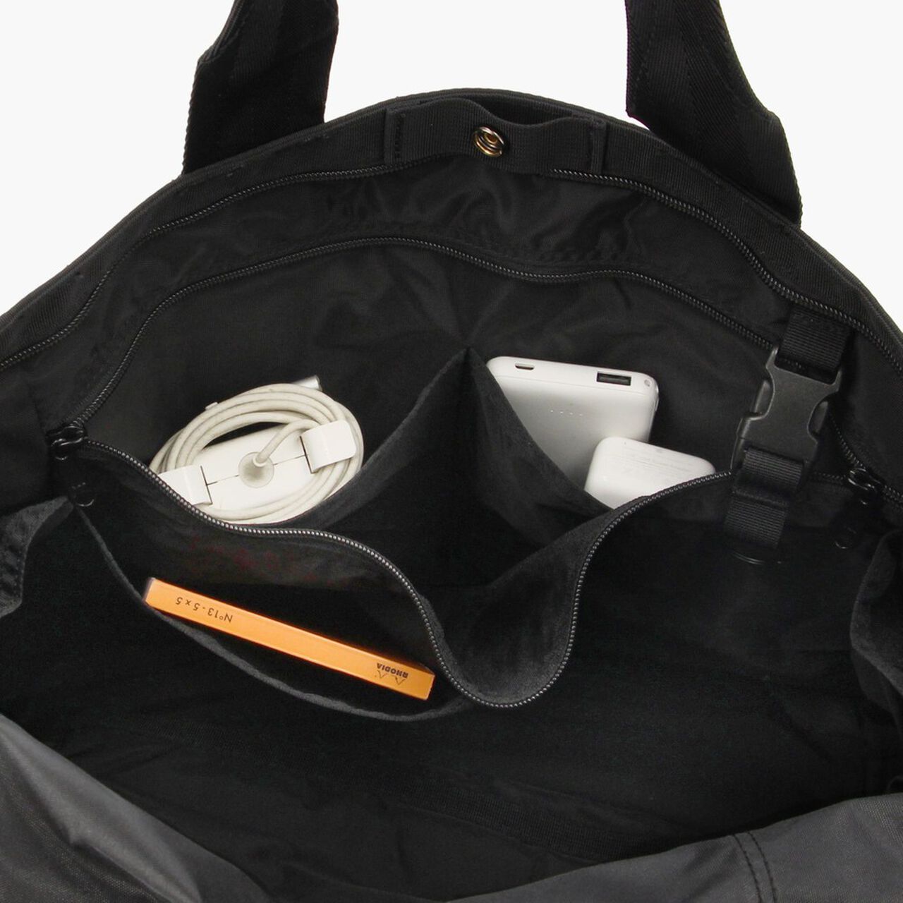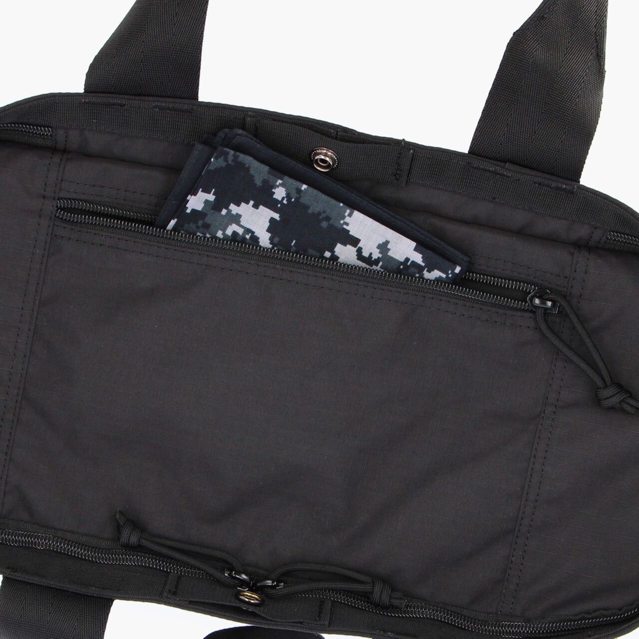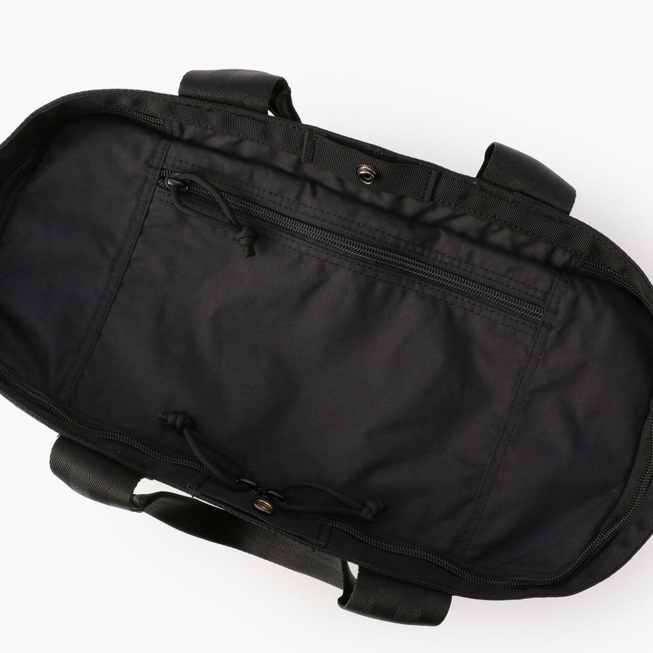 This is a tote bag from the MODULE WARE series. The material used is full-dull Cordura Ripstop Nylon. which is lightweight and strong. and features a matte texture with no sense of translucency. The main compartment is large enough to fit a B4 size bag. and can hold plenty of essential daily items such as a wallet and drink bottle. as well as business items such as documents. The interior is equipped with a PC compartment and a tablet compartment for carrying your gadgets. It is equipped with an impeccable number of interior and exterior pockets for storage. It also features a zippered opening with a pocketed canopy. It reduces the intrusion of rain and dust. protects your privacy. and prevents your stuff from flying out. The opening can also be fastened with a snap button.