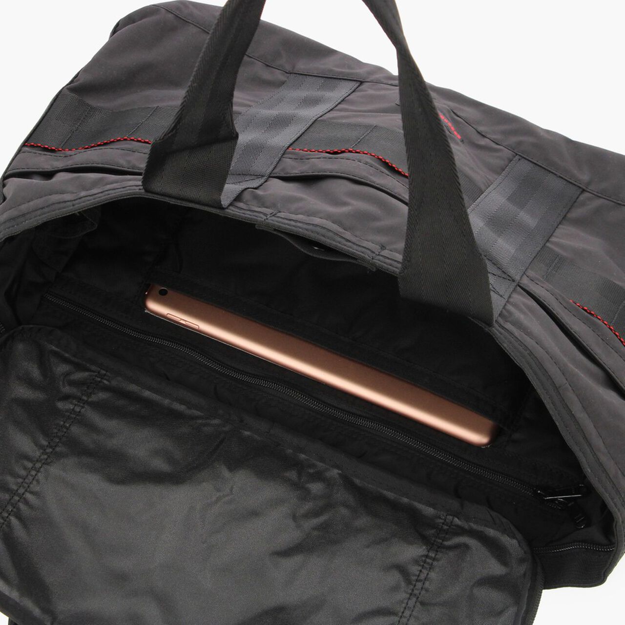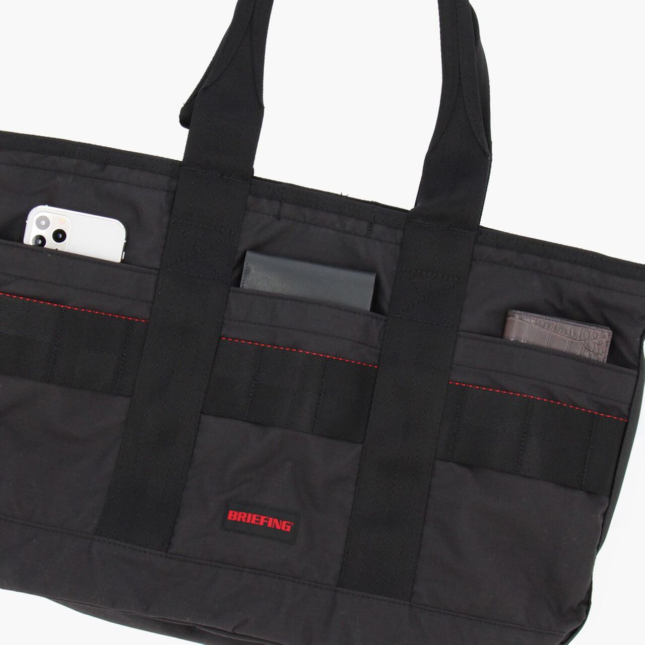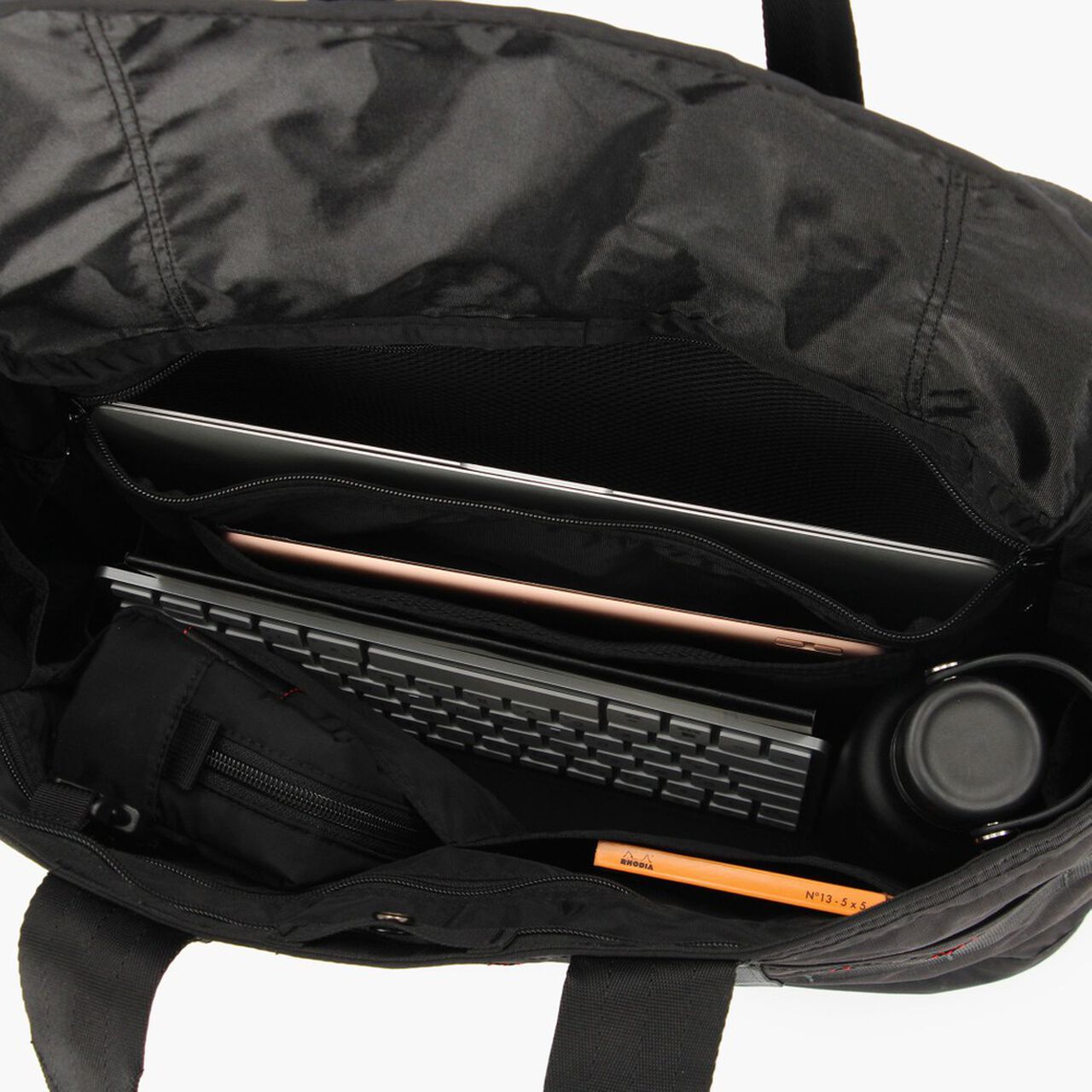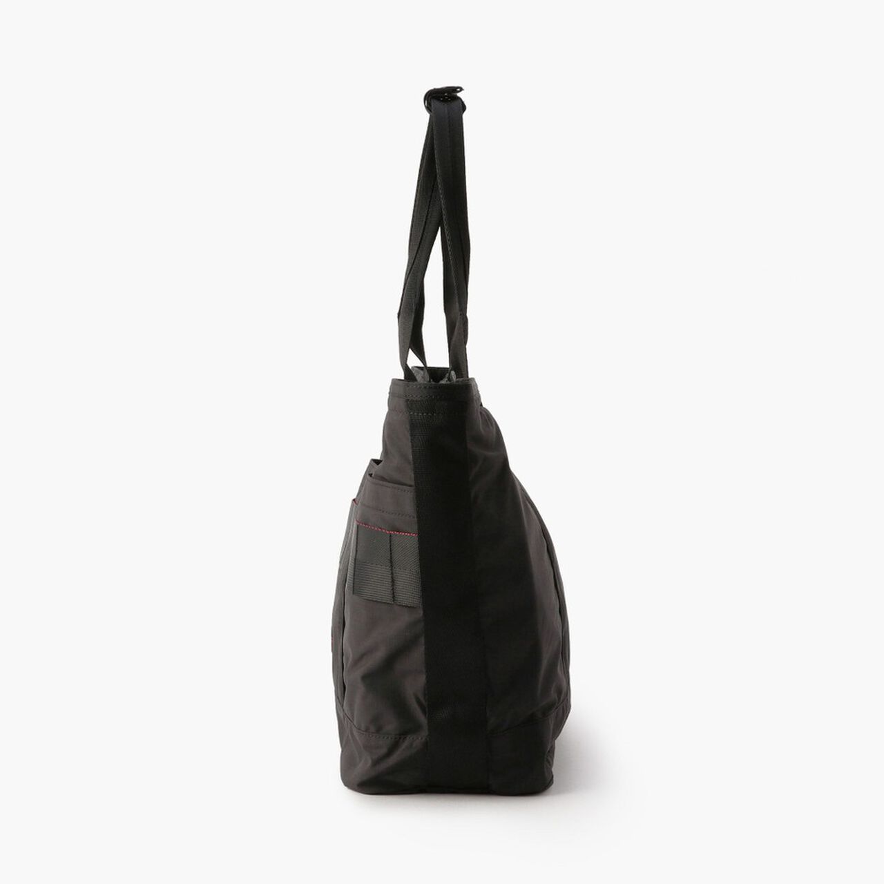 This is a tote bag from the MODULE WARE series. The material used is full-dull Cordura Ripstop Nylon. which is lightweight and strong. and features a matte texture with no sense of translucency. The main compartment is large enough to fit a B4 size bag. and can hold plenty of essential daily items such as a wallet and drink bottle. as well as business items such as documents. The interior is equipped with a PC compartment and a tablet compartment for carrying your gadgets. It is equipped with an impeccable number of interior and exterior pockets for storage. It also features a zippered opening with a pocketed canopy. It reduces the intrusion of rain and dust. protects your privacy. and prevents your stuff from flying out. The opening can also be fastened with a snap button.