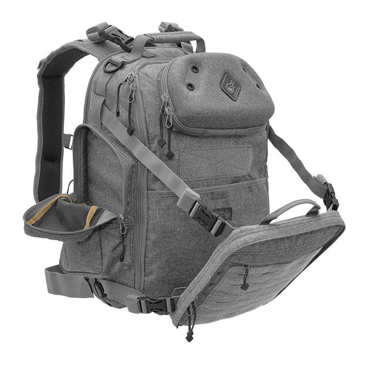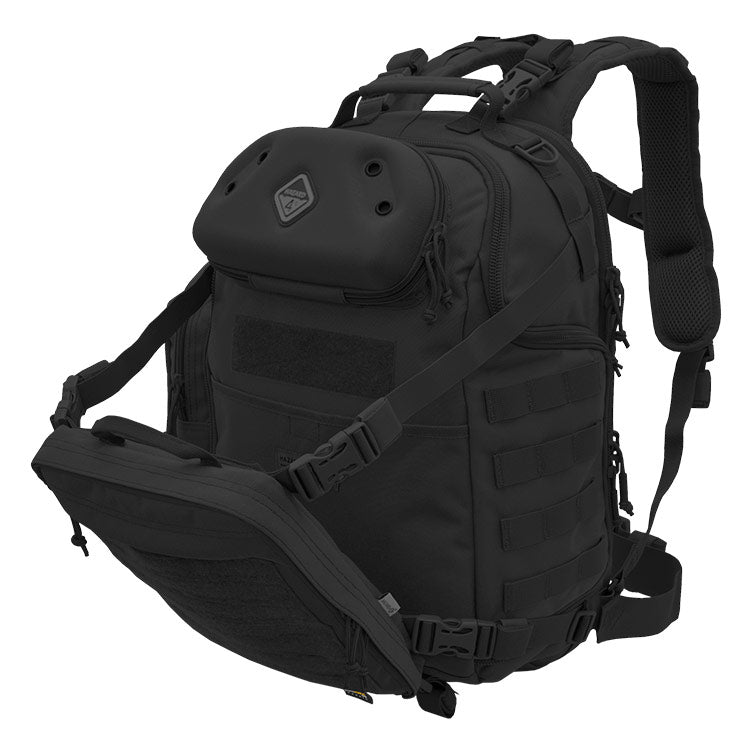 This is Hazard 4®’s first daypack with an external load-carrier ‘beavertail’ for helmets. jackets. etc. The carrier can flip 180° down to manage long loads like rifles. and the bottom hinges allow detaching & expanding. Drawbridge has a unique top. perimeter. or side sling-style zipper access choice. and the load carrier has an admin area. There’s a molded top-shell to protect optics. and other breakables. and is also a base for our exclusive HardPoint® hardware parts. A large zip pocket on the side fits Nalgene bottles. radios. etc.. and a padded laptop/hydration area in soft molded back panel can fit laptops up to 17. The back panel adds structure. back safety & air circulation. and also has a removable luggage trolly-handle strap. When this luggage strap is off. loops are left for carabiners. etc. Drawbridge comes with our removable. minimal waist belt w/ patented roto-lock buckle. and fuzzy liner on inner walls for optional dividers/photo bin inserts. Side compression straps can hold objects to pack’s sides. and there’s a large flat pocket under carrier & on pack-back. Other features include: supersized laser-cut MOLLE & velcro i.d. patch panel. MOLLE loops on 3 sides & harness for pouches. etc.. and sternum strap with elastic auto-adjust. 2-position belt height.