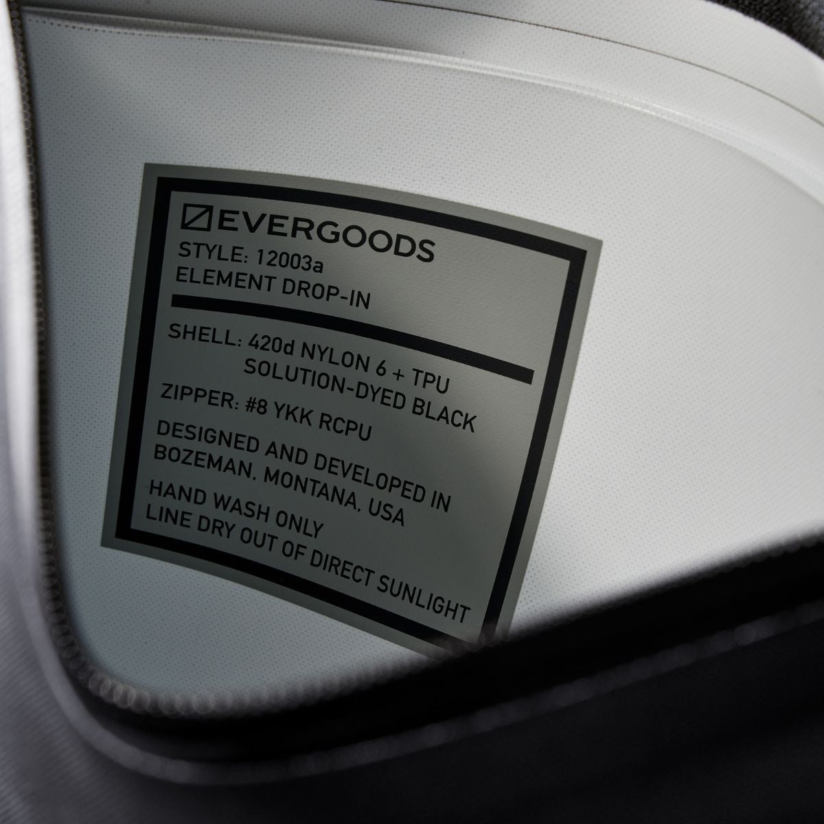 Minimalist yet substantial. utilitarian but still elegant; the ELEMENT Drop In is an essential weatherproof tool in your carry arsenal. Backed by 3+ years of internal R&D efforts. EDI is constructed using radio frequency welding and flat bonding techniques. This is made possible by a custom-developed solution-dyed black textile with a TPU laminate and kiss-coated face. Despite its slim appearance. our signature 3D patterning. mobile dividers. and drop-in slots allow EDI to flex to hold a myriad of everyday and travel loadouts: travel essentials to tech items to even camera kits.