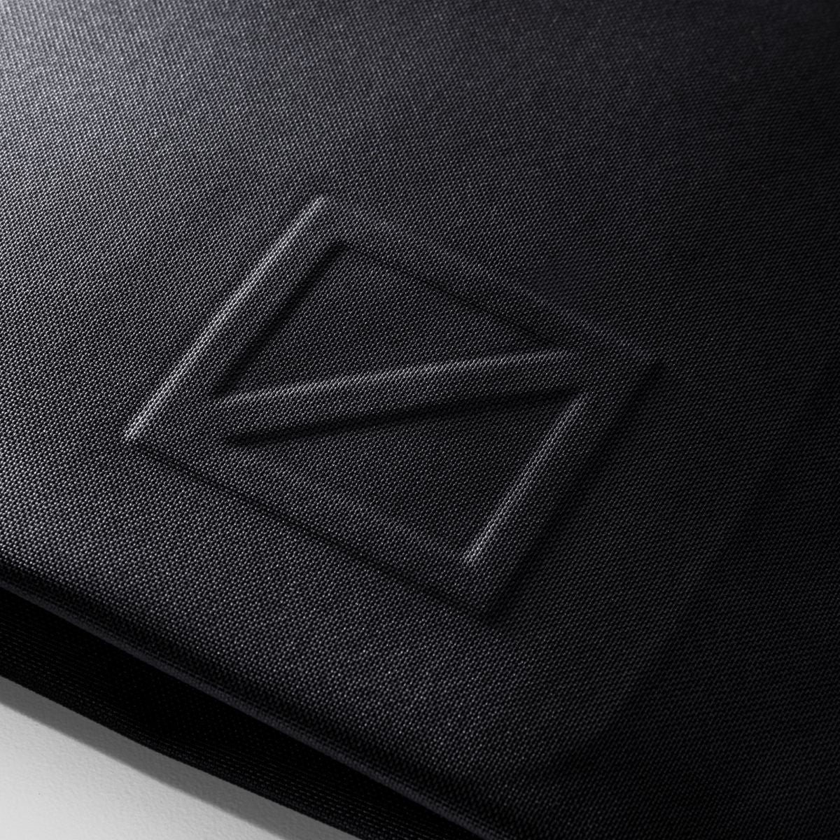 A custom-developed solution dyed black 420D nylon 6. finished with a white PU laminate on the back and PU kiss-coat on the face.