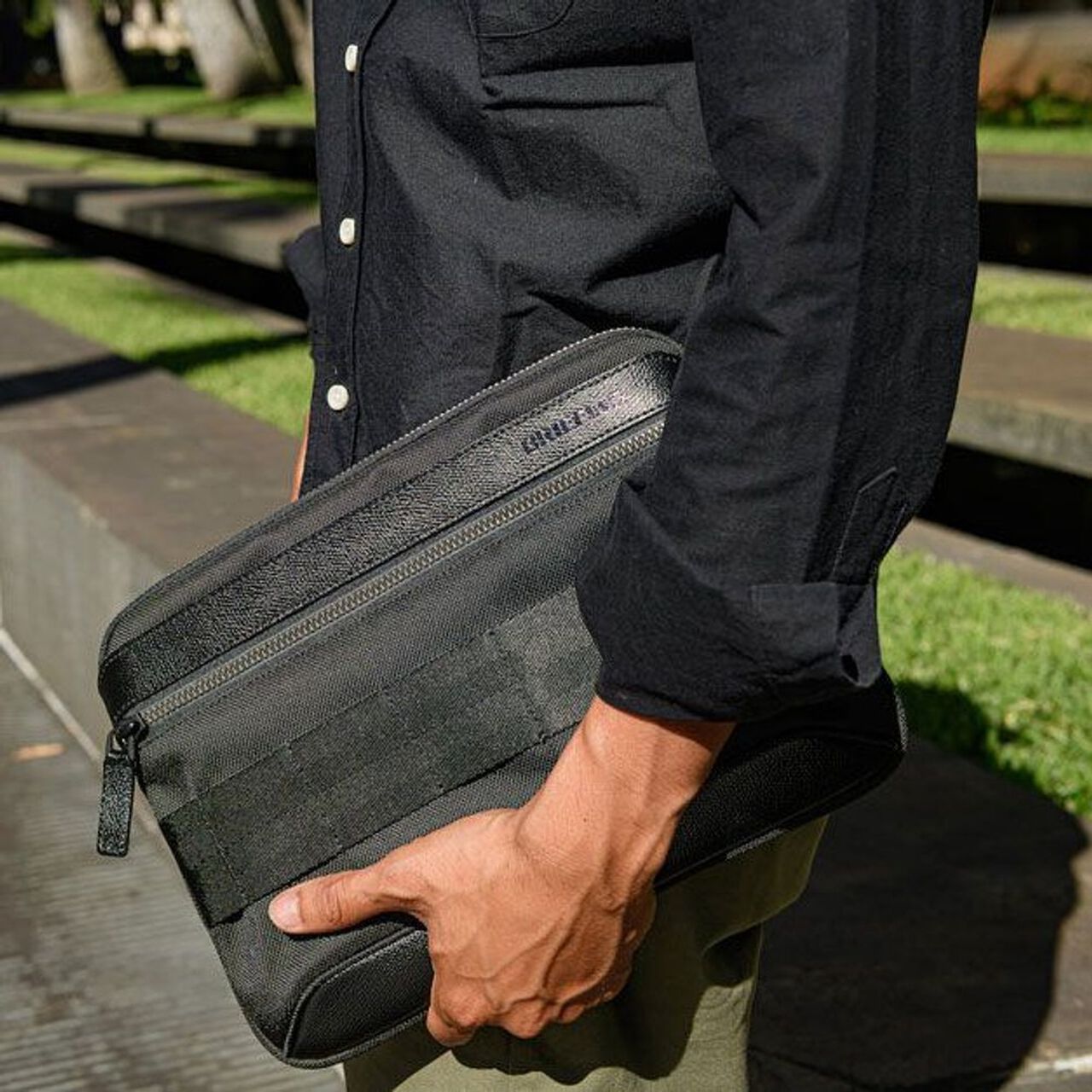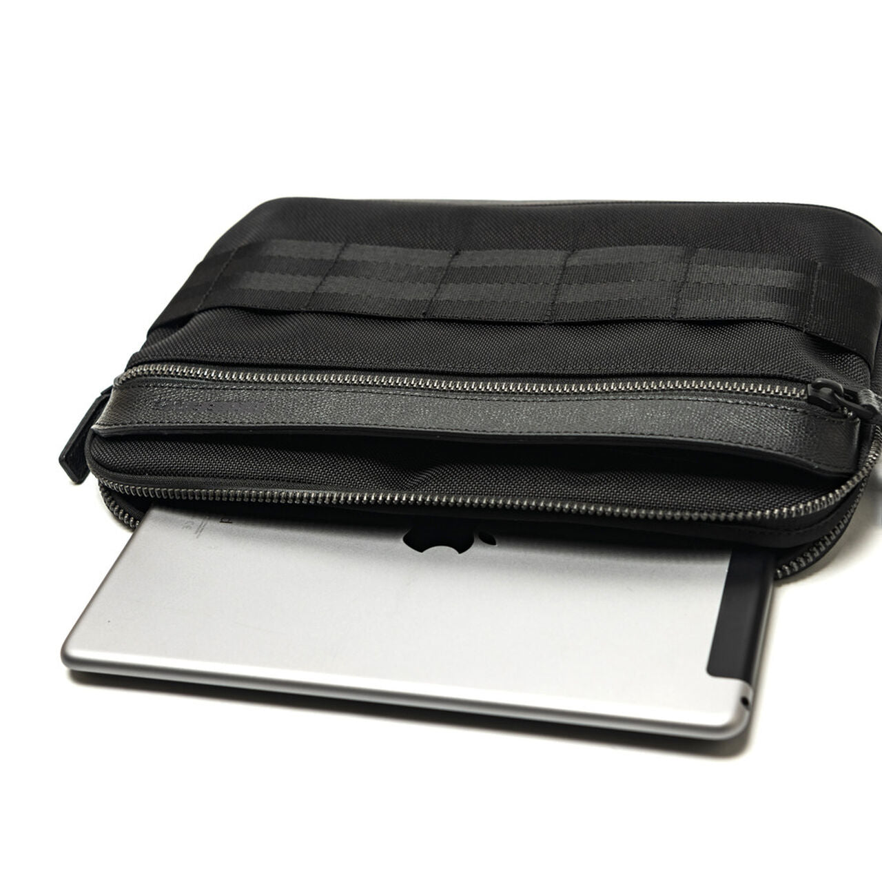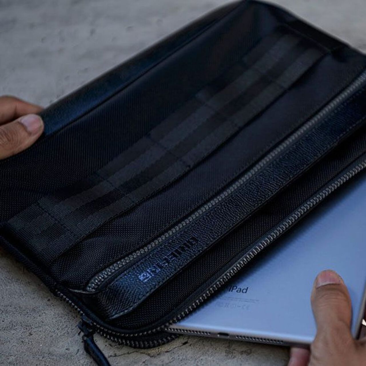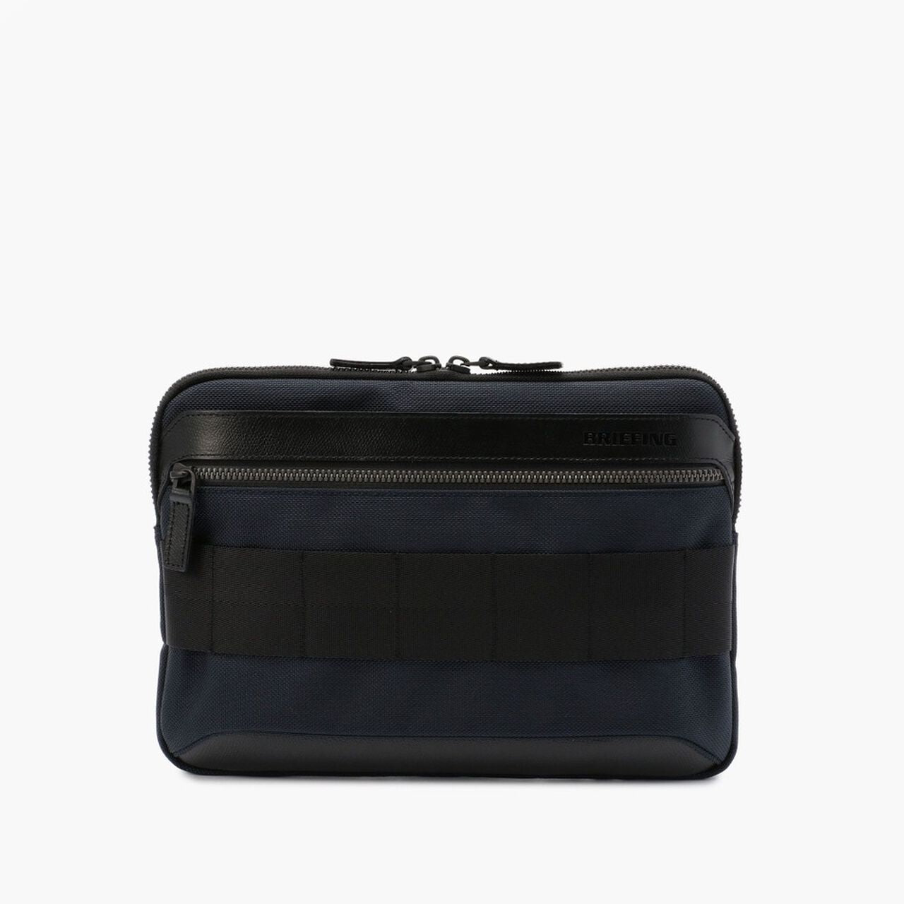 A perfect grab-and-go pouch. this clutch fits all the essentials: credit cards. phone. change. a pen and your keys. Made of a water proof leather and 1680 denier nylon. a durable and abrasion resistant material. The interior includes a padded laptop and tablet compartment that fits up to 11. The front features pocket for your smartphone and other small items such as chargers and cables. The brand’s logo on the leather gives it a premium feel. while the chic design retains its BRIEFING character.