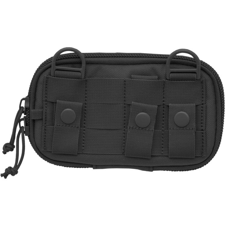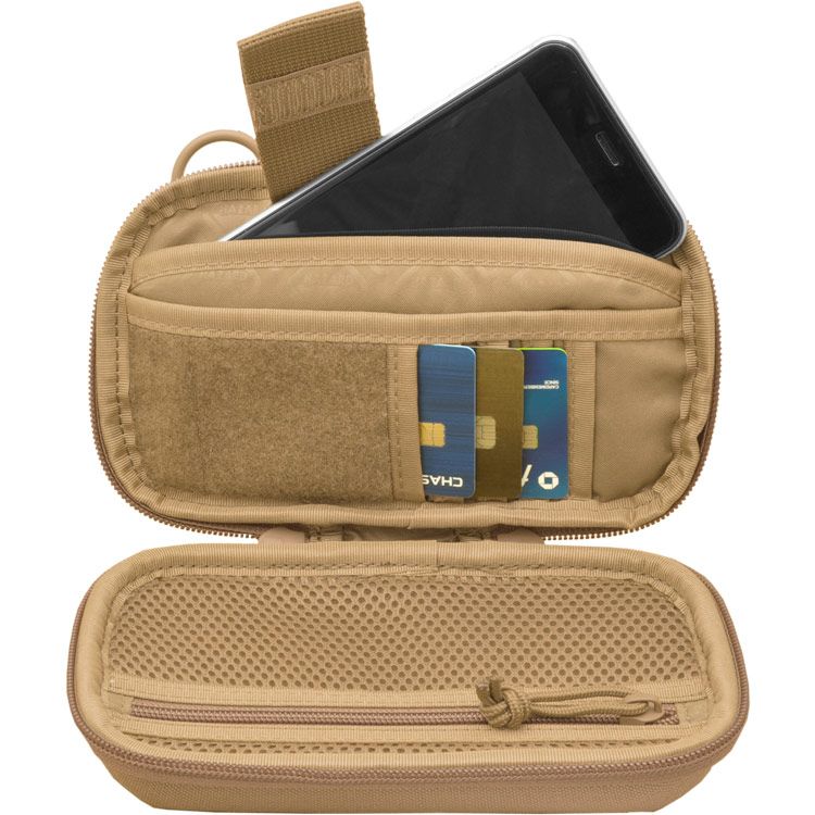 Hatchling combines the function of a phone case with a high capacity wallet. With a modern. yet minimal tactical aesthetic. this one of a kind phone/admin case has molded foam for light weight protection. The case can be attached horizontally on a belt. or use the multi way. back molle straps for attaching on pack straps. sides. etc. Fits large phones like the latest iPhone Max. and phone retainer has a pen loop at its end. There are 7 slots for credit cards. as well as a slot for currency bills. etc. above the cards. Hatchling also includes: front & internal fuzzy areas for patches. 3D mesh zip area for additional contents. and d-rings for an optional strap. etc.