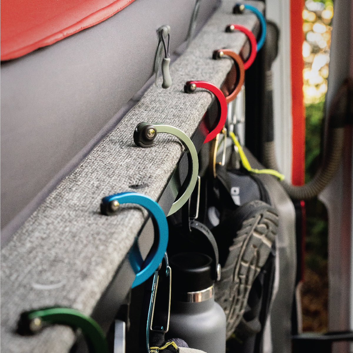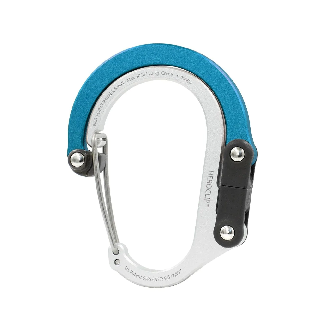 Our tiny but mighty Heroclip Mini gear clip lets you hook and hang small items. such as lights from a tent or a tree branch. bags and toiletry kits from towel racks. or tiny speakers from a wire shelf. This versatile gear clip hangs securely. rotates 360°. and folds compactly in ways other carabiners. clips and hooks can’t. helping you keep your gear organized and exactly where you want it. no matter the activity. The clip also features a wider clip gate compared to standard carabiners and clips. and a hook with a grippy rubber tip.