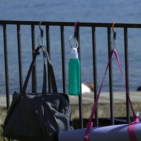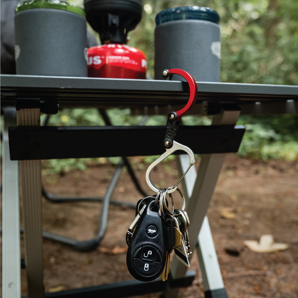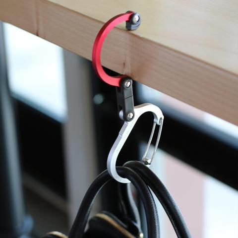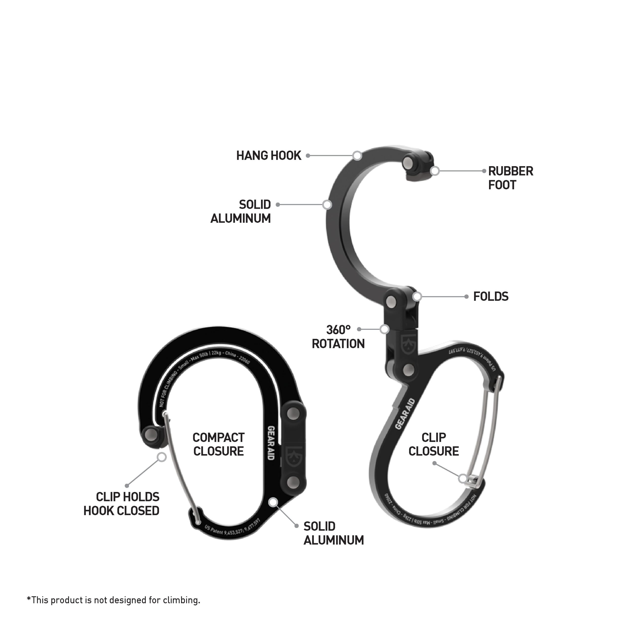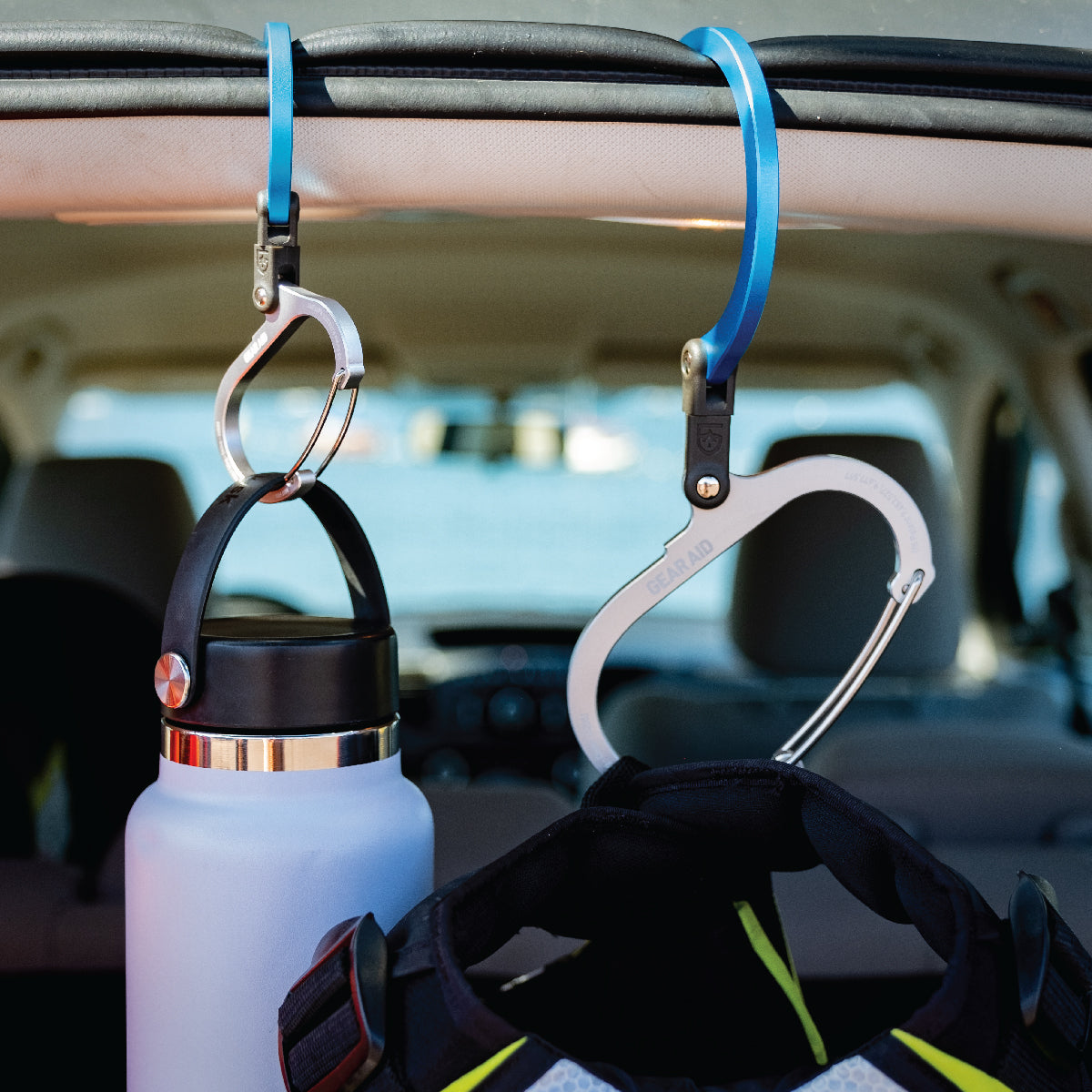Heroclip Small gear clip lets you hook and hang water bottles at the campsite. and backpacks from shelves. counters. tables. chairs. or even doors. They’re also great for hanging gravity filters from tree branches. tools from ladders. or carry-on bags from roller suitcase handles. This versatile gear clip hangs securely. rotates 360°. and folds compactly in ways other carabiners. clips and hooks can’t. helping you keep your gear organized and exactly where you want it. no matter the activity. The clip also features a wider clip gate compared to standard carabiners and hooks. and a hook with a grippy rubber tip for hanging things from flat surfaces.