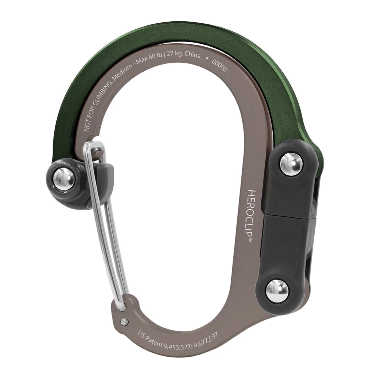 Heroclip Medium gear clip lets you hook and hang big backpacks from trees. duffle bags from fences. buckets from ladders. and dromedary bags at camp. This versatile gear clip hangs securely. rotates 360°. and folds compactly in ways other carabiners. clips and hooks can’t. helping you keep your gear organized and exactly where you want it. no matter the activity. The clip also features a wider clip gate compared to standard carabiners and hooks. and a hook with a grippy rubber tip for hanging things from flat surfaces.
