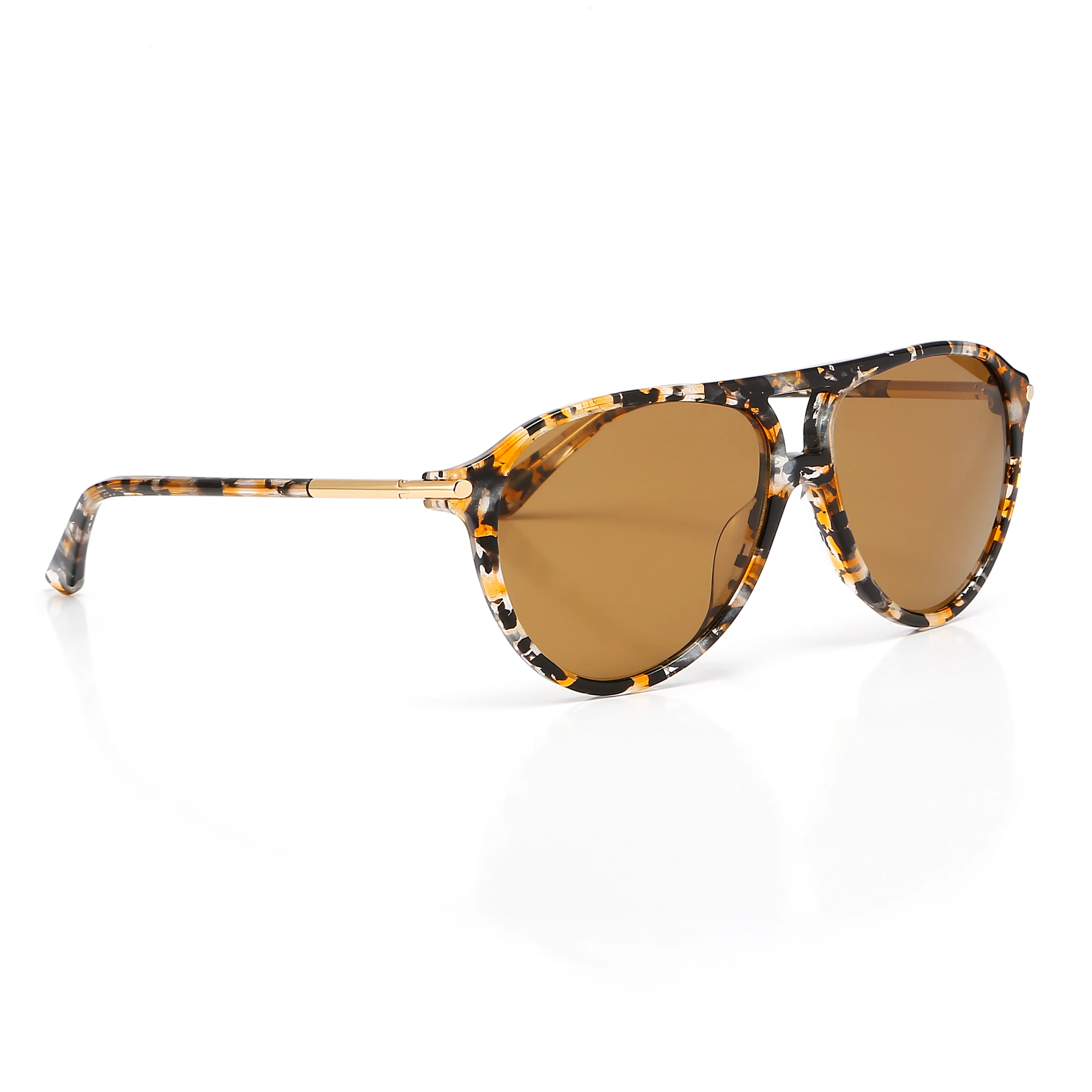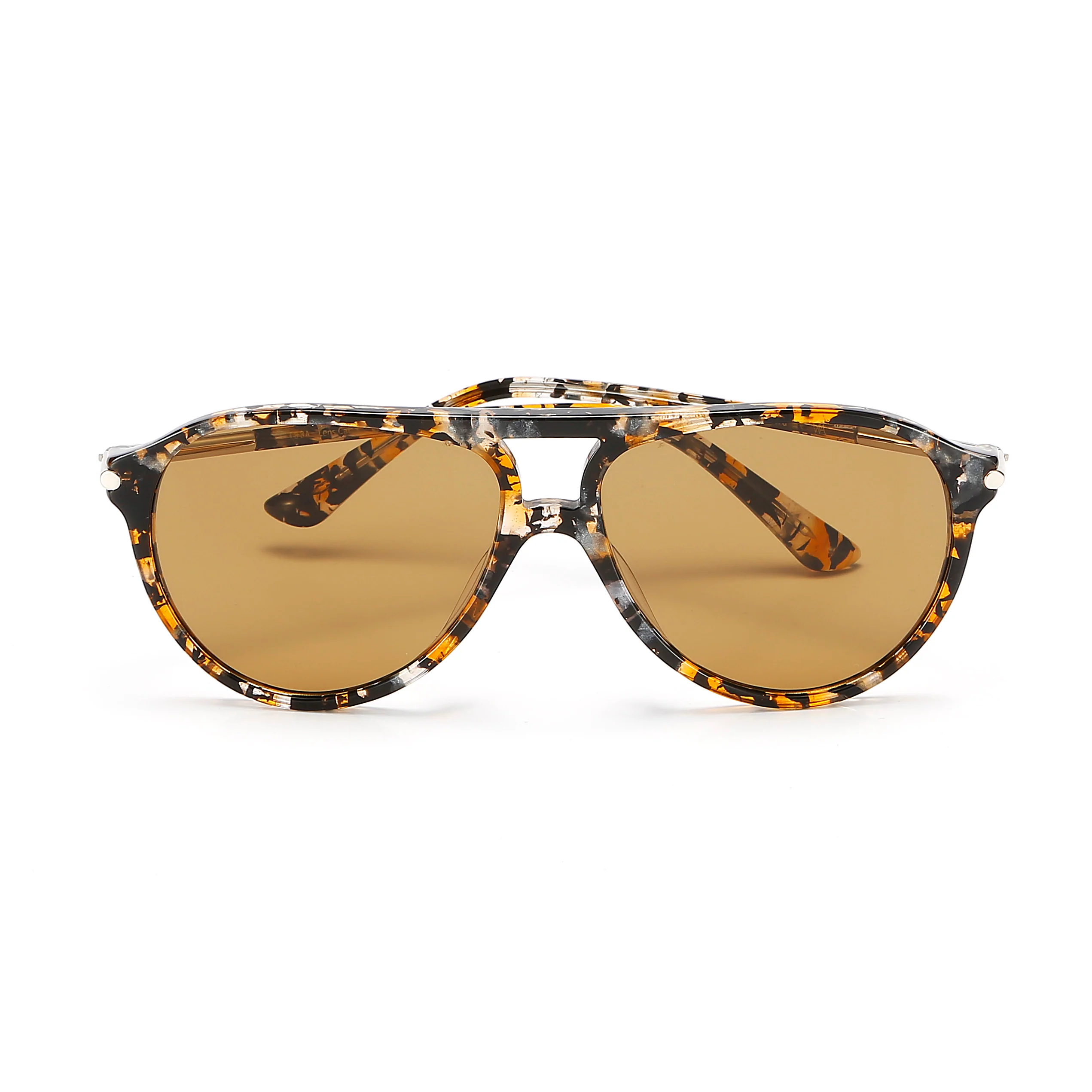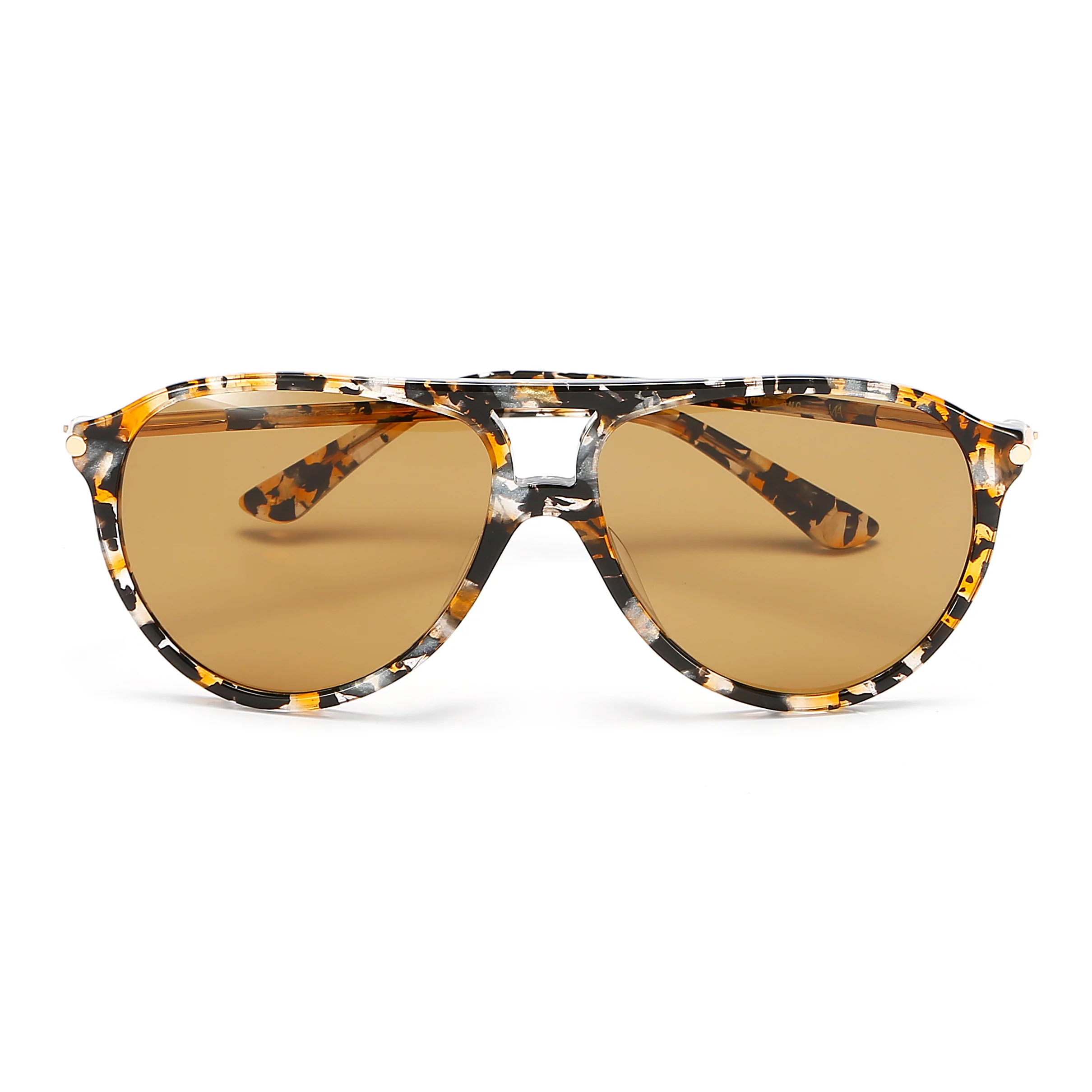 Aviator-like shape sunglasses are made from patterned brown acetate. Add to the retro feel with a double brow bar. This pair has brown tinted lenses accented with brown-tone frame and gold-tone metal arms. The metal arms tipped with acetate for comfort. This item is unisex.
