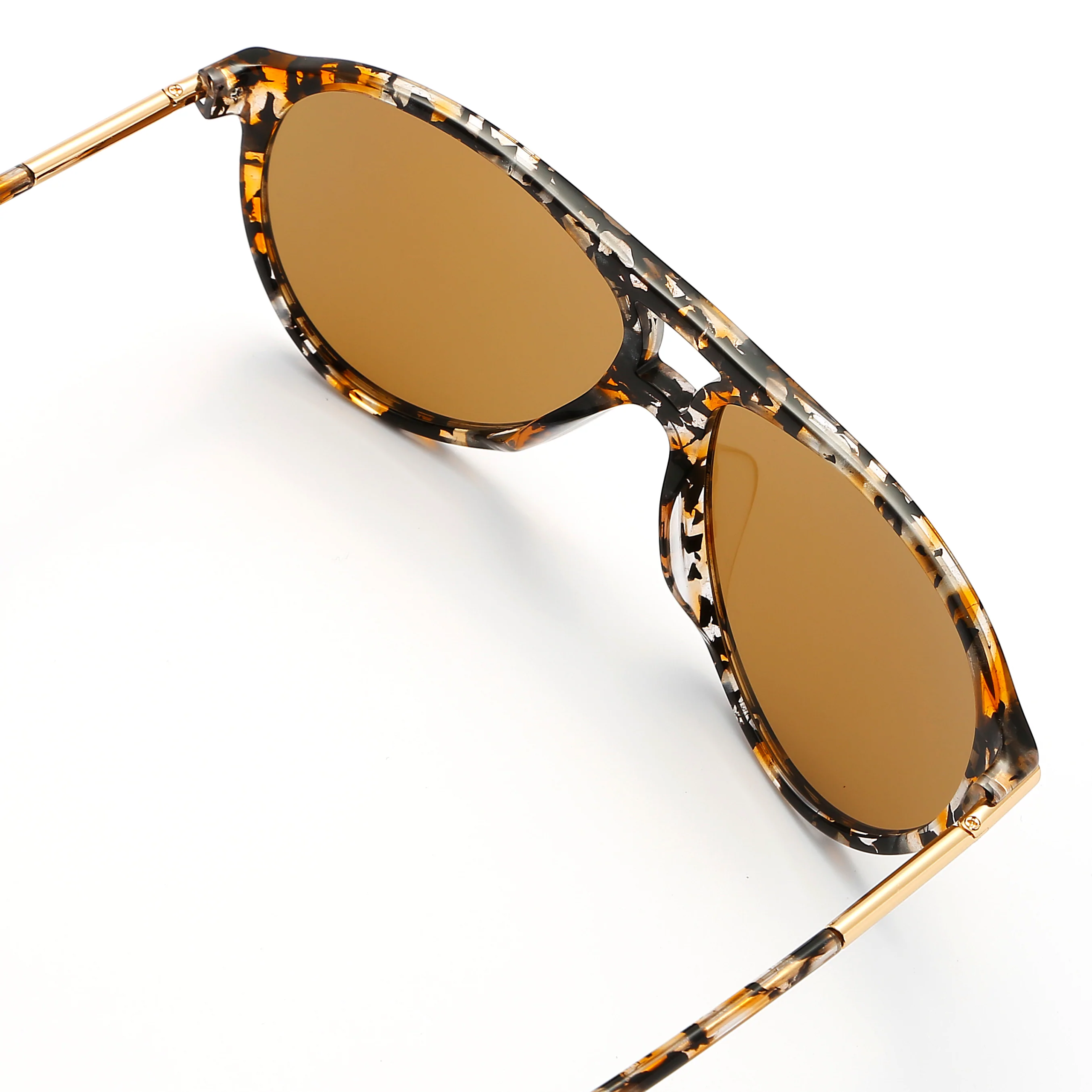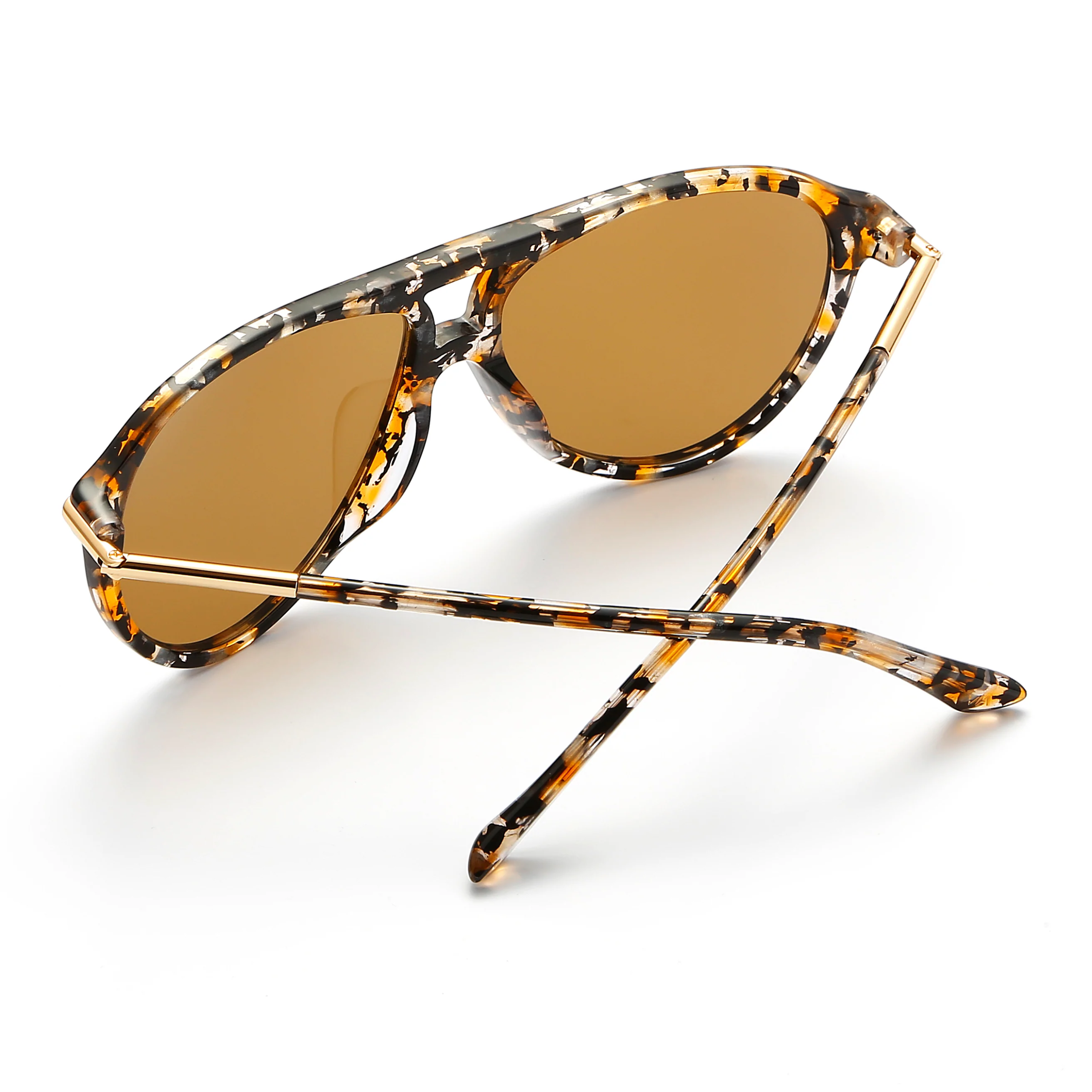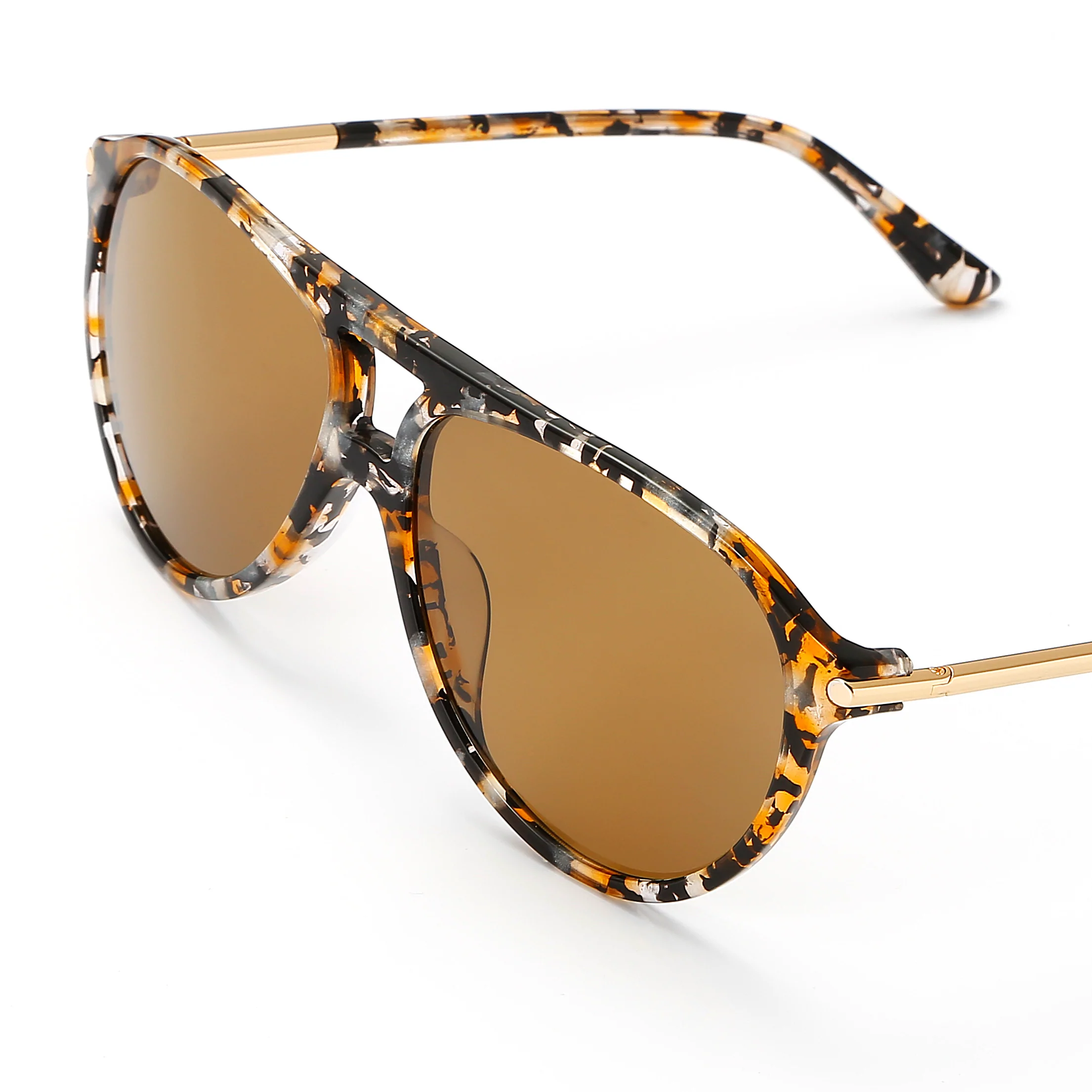 Aviator-like shape sunglasses are made from patterned brown acetate. Add to the retro feel with a double brow bar. This pair has brown tinted lenses accented with brown-tone frame and gold-tone metal arms. The metal arms tipped with acetate for comfort. This item is unisex.