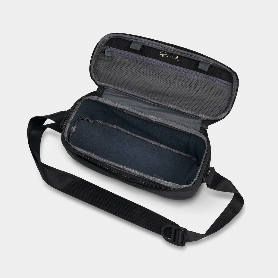 The Luma Camera Sling 12L. Designed in collaboration with Peter McKinnon. is a photographer’s compact powerhouse. Despite its slender silhouette. the Luma Camera Sling 12L is deceptively spacious. accommodating an impressive amount of gear. When you prefer to forgo the bulk of a backpack. this sling proves itself with its generous interior. Inside there are customizable. shelved dividers that allow for flexible gear organization tailored to your specific needs. The top opens fully for immediate. fuss-free access. with magnetic closures for the moments in between shots. keeping them secure. Inside. you will also find internal pockets for small essentials and an external pocket tailored for quick-reach items like phones.