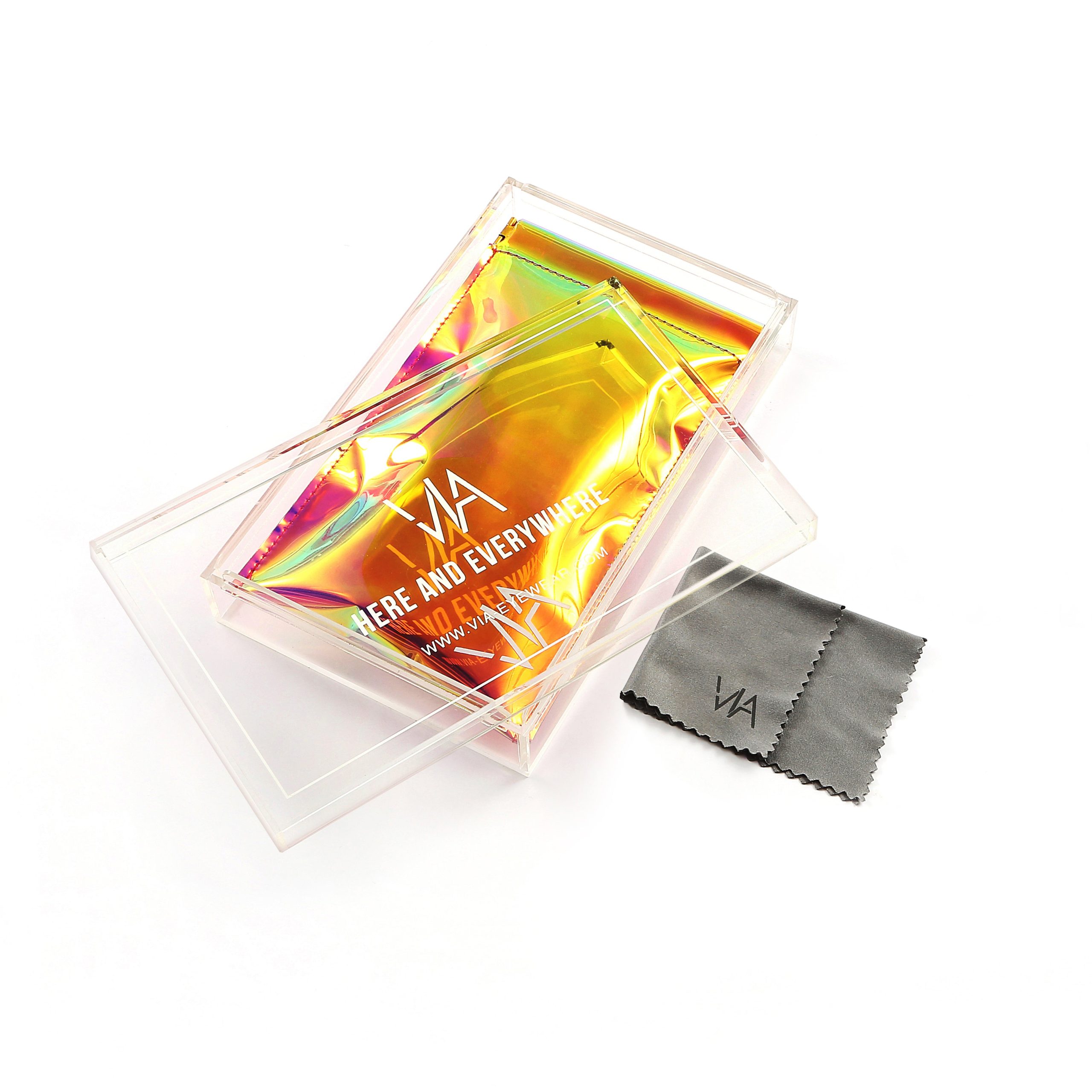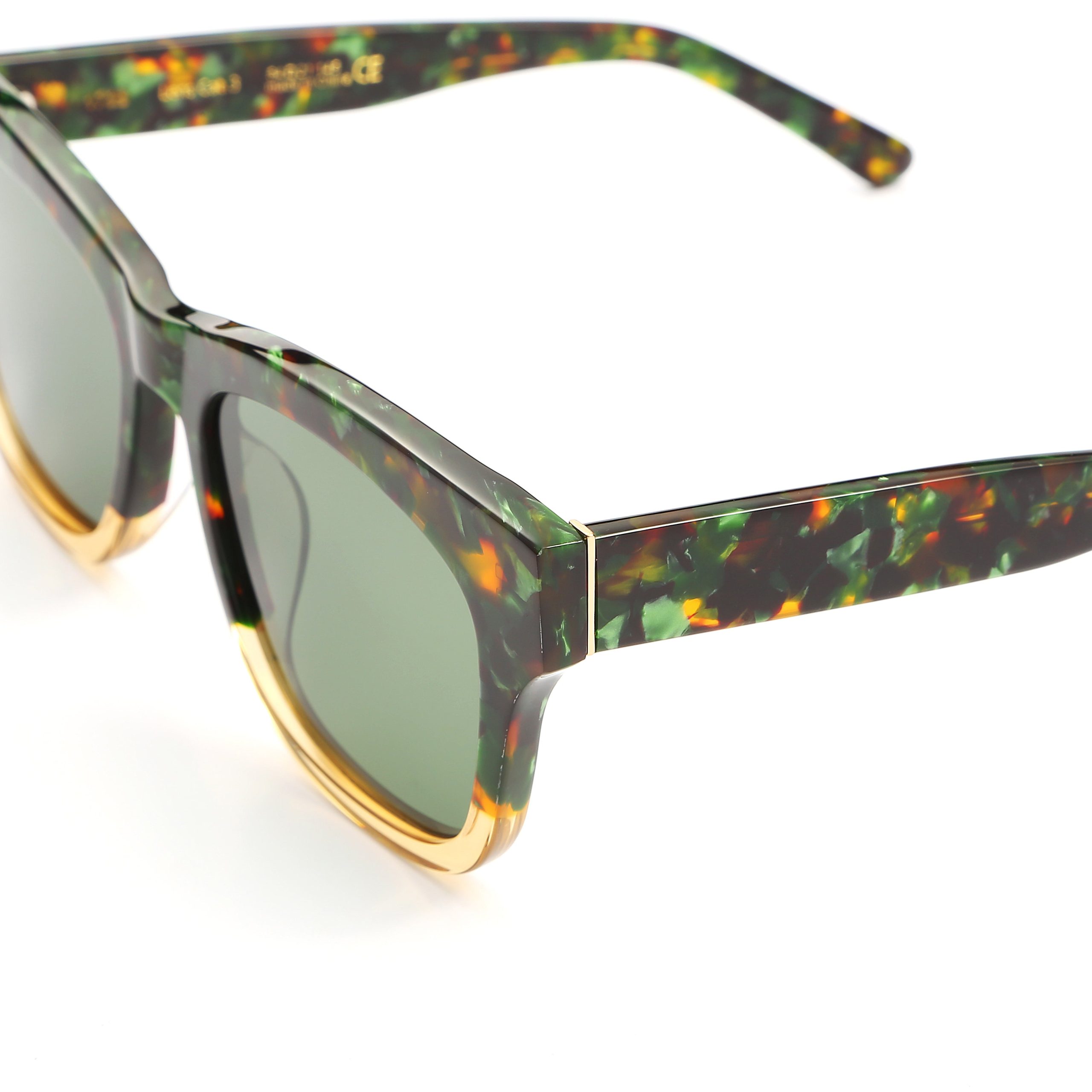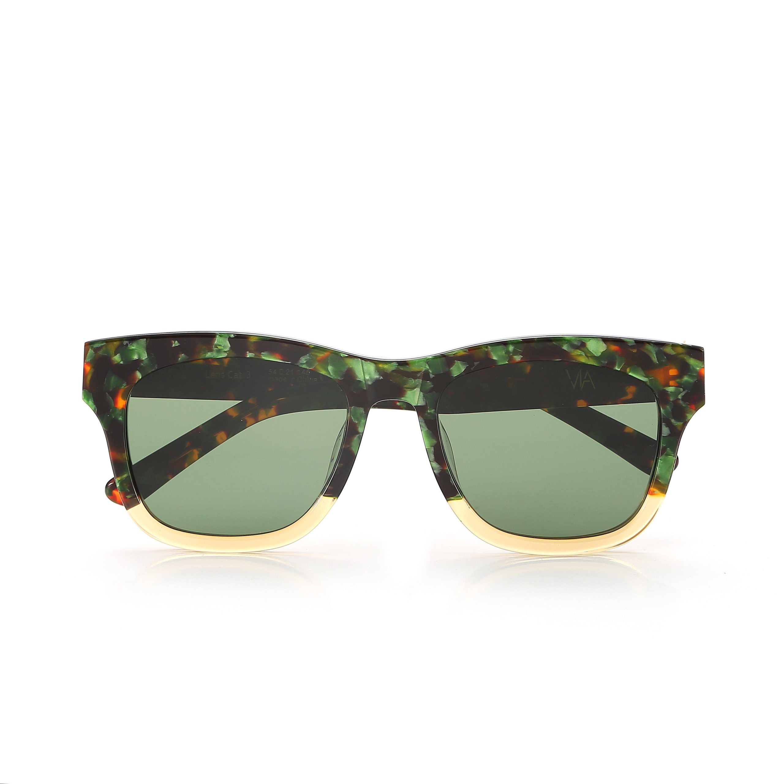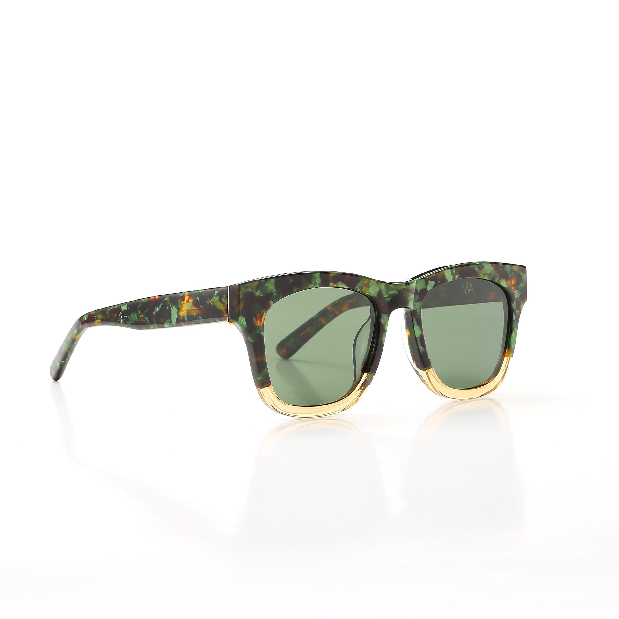 Wide rectangular frame composed of bi-colored acetate in green nacre and transparent yellow. This unisex pair is especially flattering on rounder face. Perfect for men and women everyday wear or match with activewear.