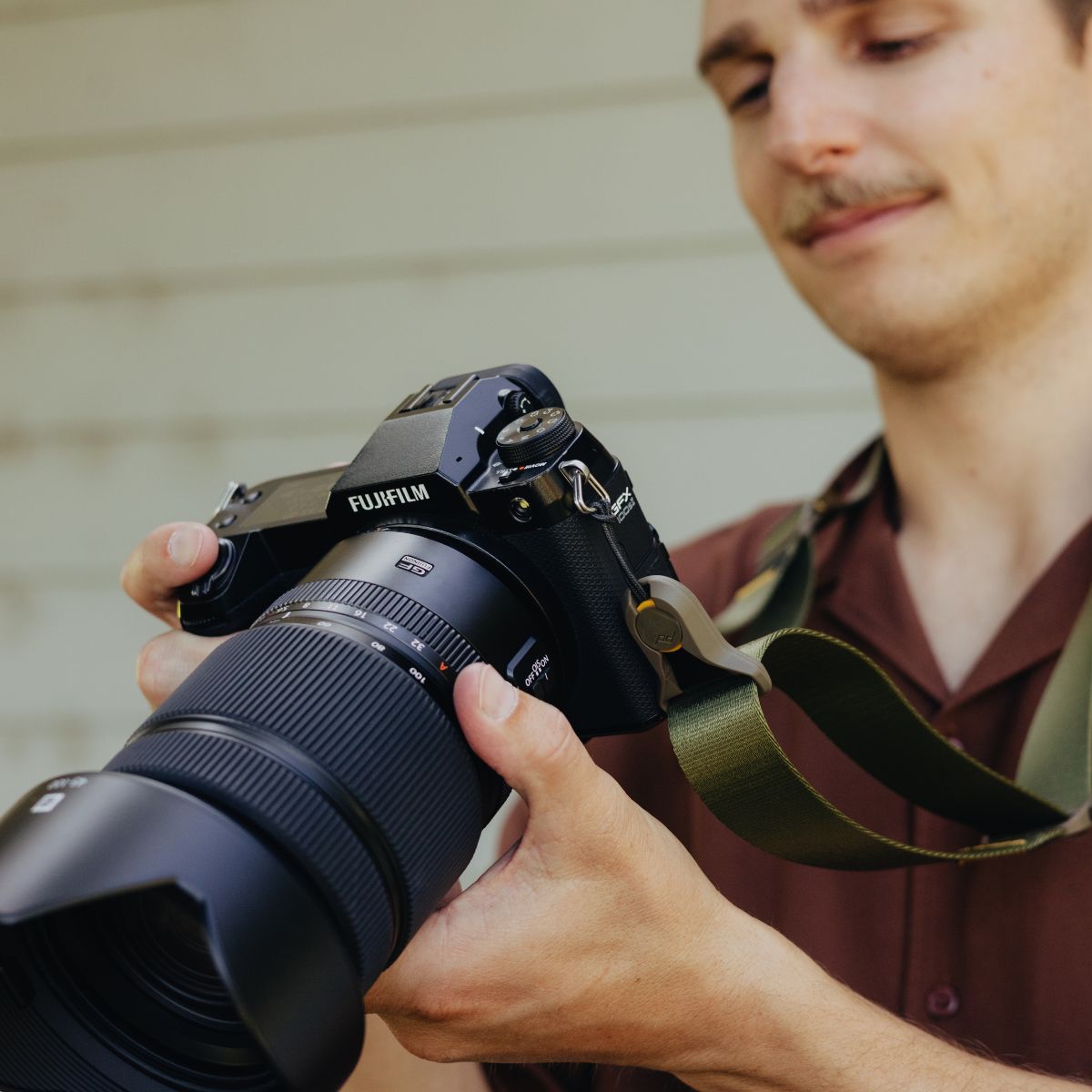 Connects to strap loops or bottom of camera body via ultra low-profile Anchor Mount hardware.