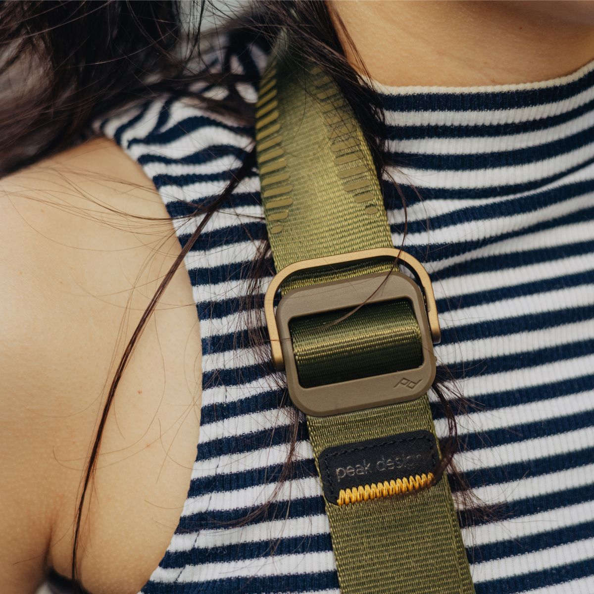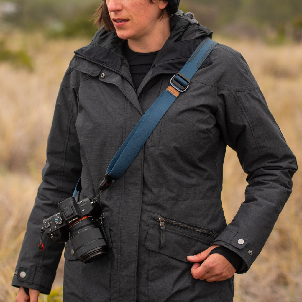 Huge range of length adjustment. made possible by 2 quick-pull adjusters. Webbing glides over clothing for quick camera access.