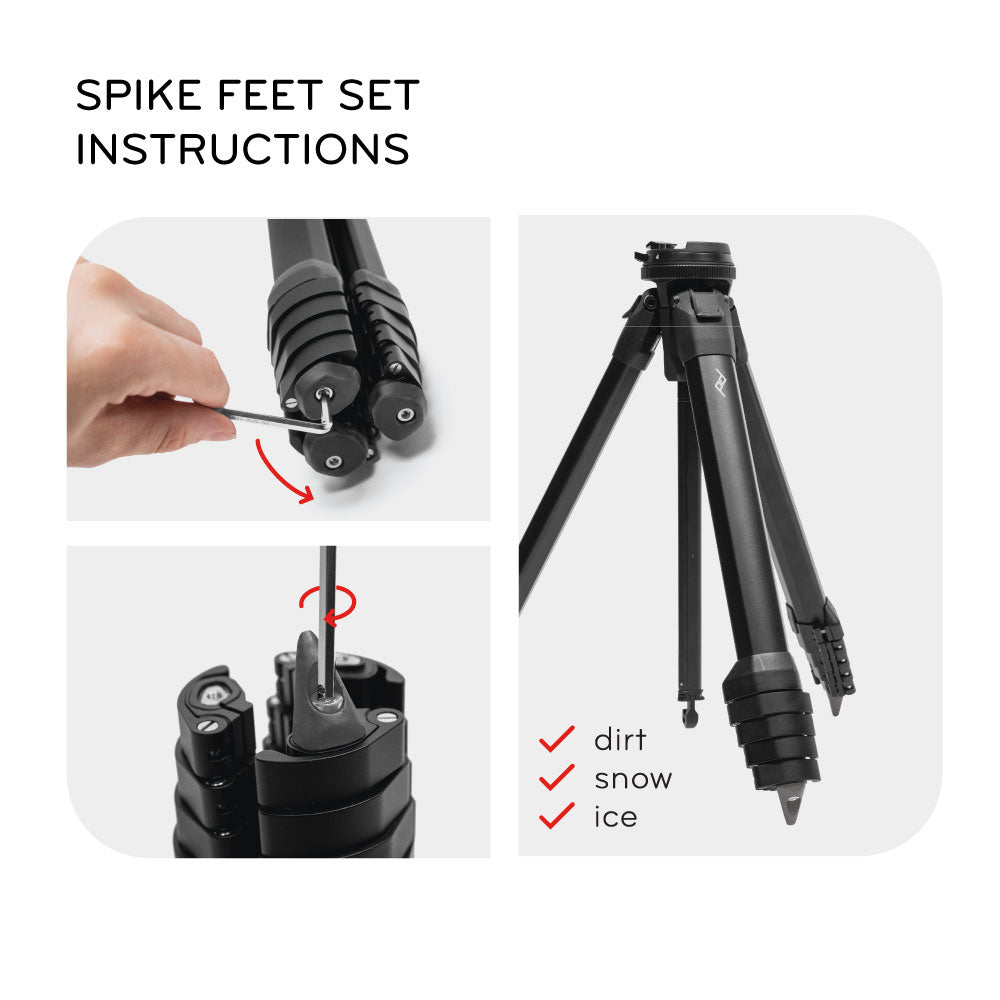 Ideal for using the Travel Tripod on ice. smooth rocks. and loose dirt or gravel. Also great when using the Travel Tripod with heavier photo or video rigs. Simply remove the Travel Tripod’s standard rubber feet and attach these 3 spike feet. Mounts using 3 hex-drive screws. hex wrench included.