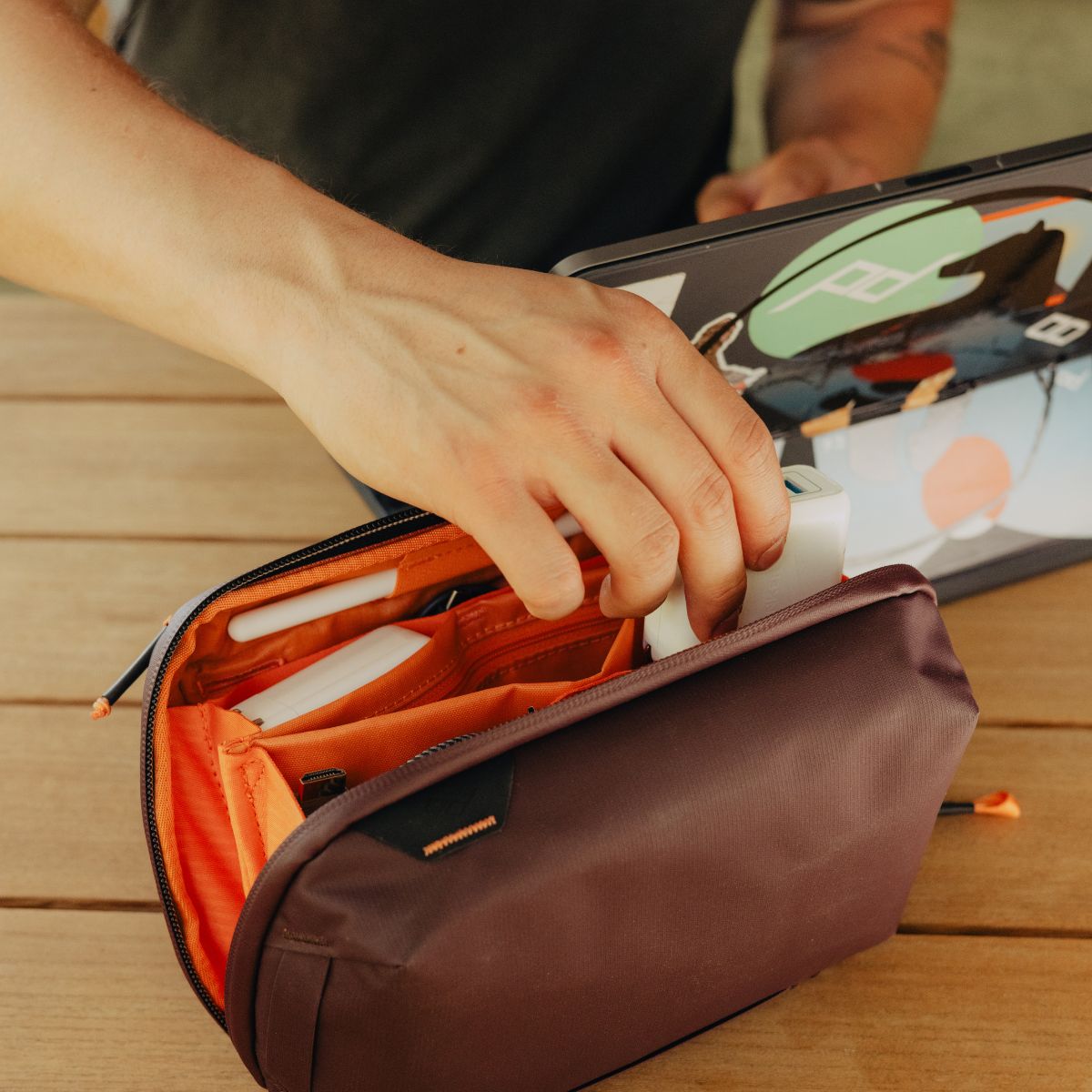 Whether storing cables. everyday gear. or travel essentials. Tech Pouch offers unrivaled organization and ease of access. Origami-style pockets create enormous spatial efficiency. letting you pack more into a smaller space while keeping your items neatly organized and easy to find. Elastic accessory loops keep items like pens. knives. SD cards. and batteries always within reach. Exterior handles and a clamshell-style opening make this pouch a delight to hold and access. External zip pocket has a cable pass-through for easy device charging. The 200D recycled nylon canvas shell is weatherproof and aesthetically clean.