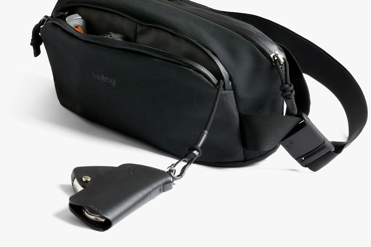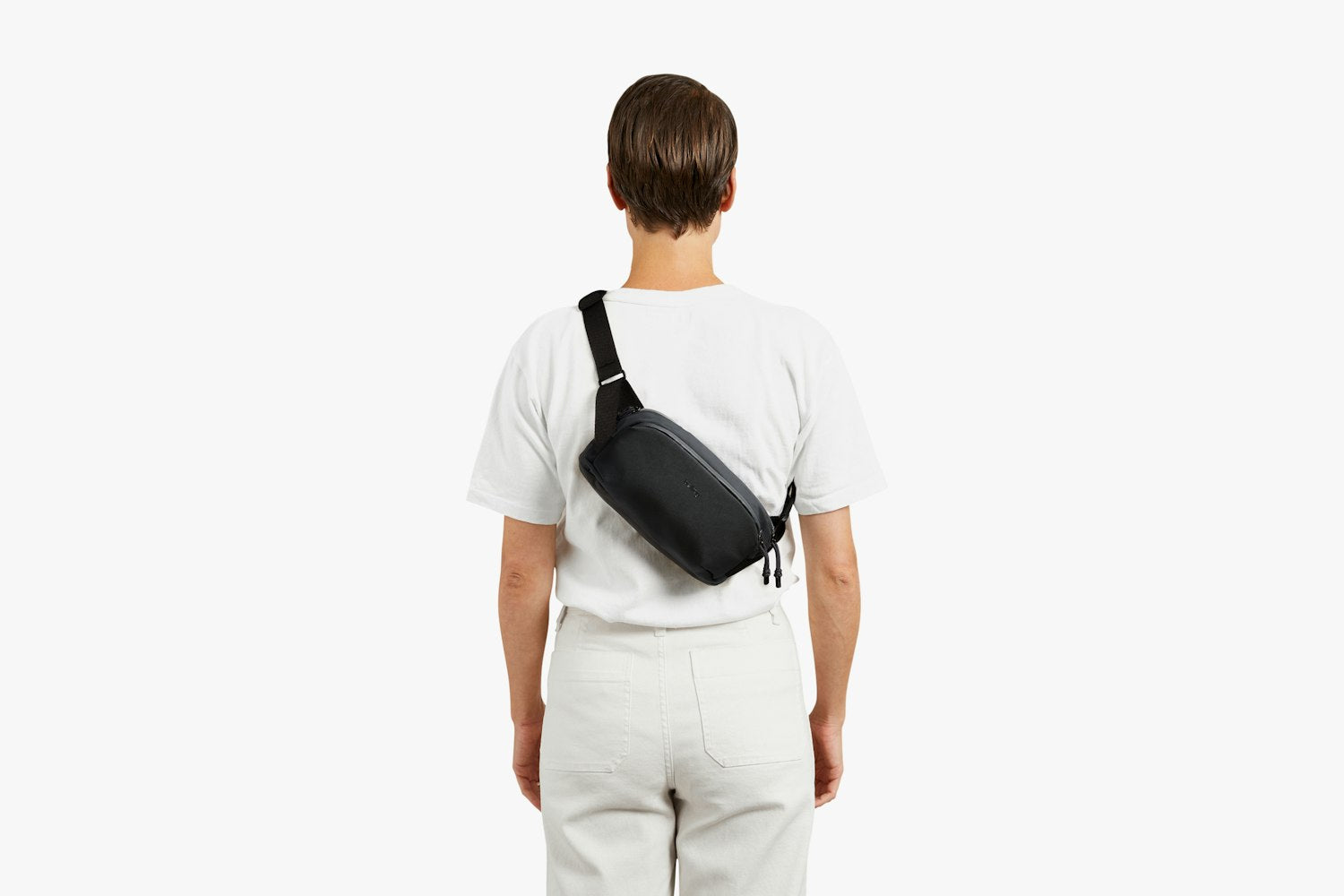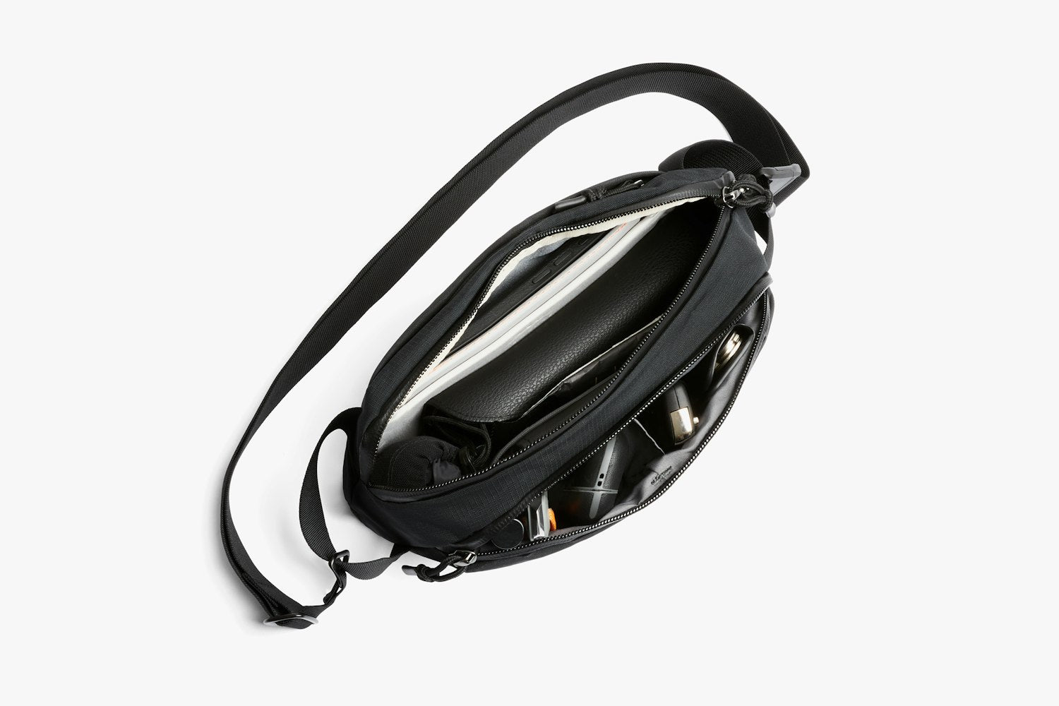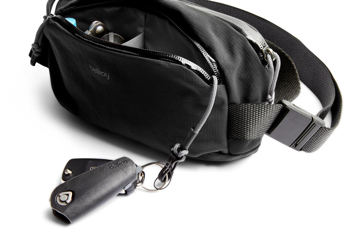 We designed the layout and access of this sling around the objects you carry every day – phone. keys. earbuds – to keep them organized and handy. but out of the way.