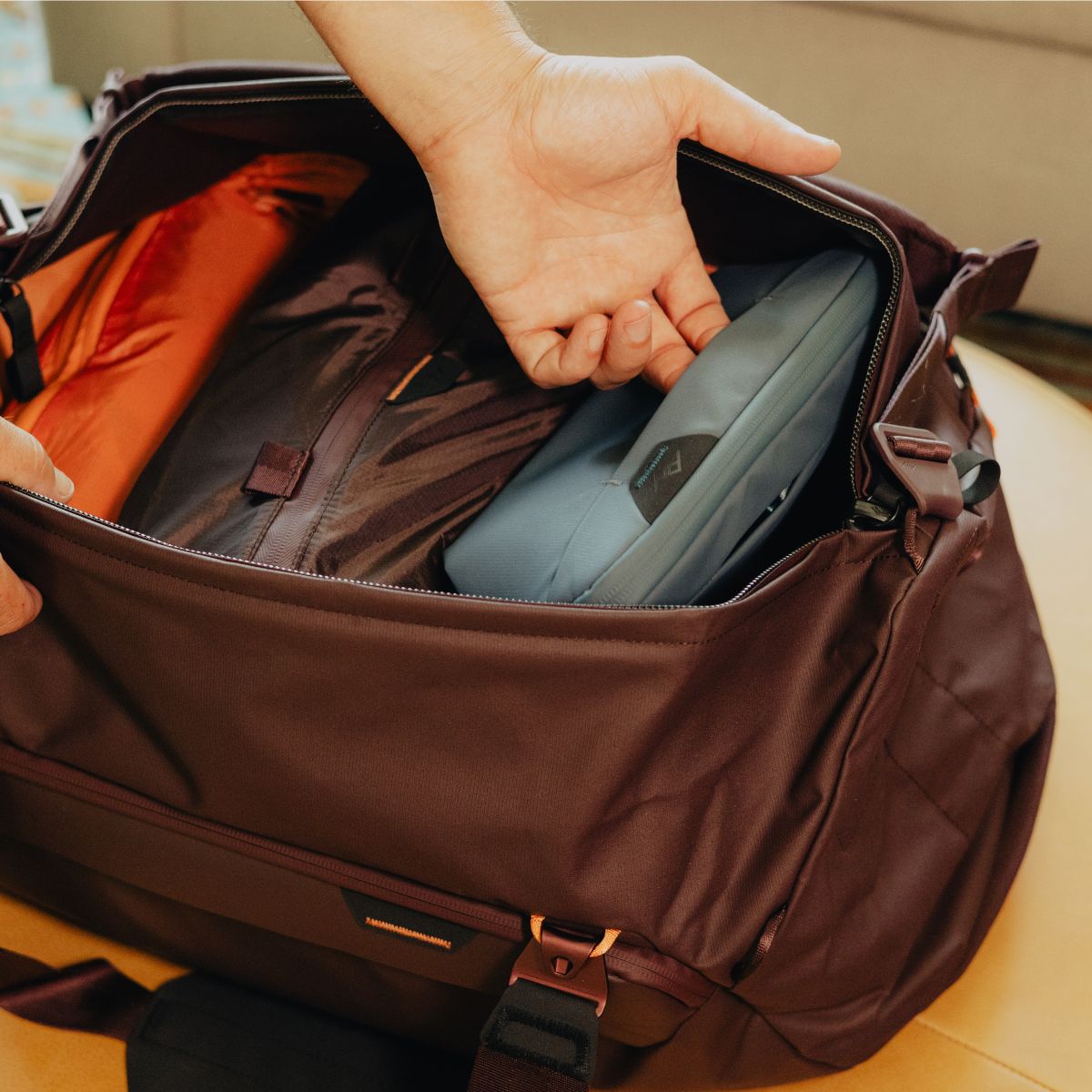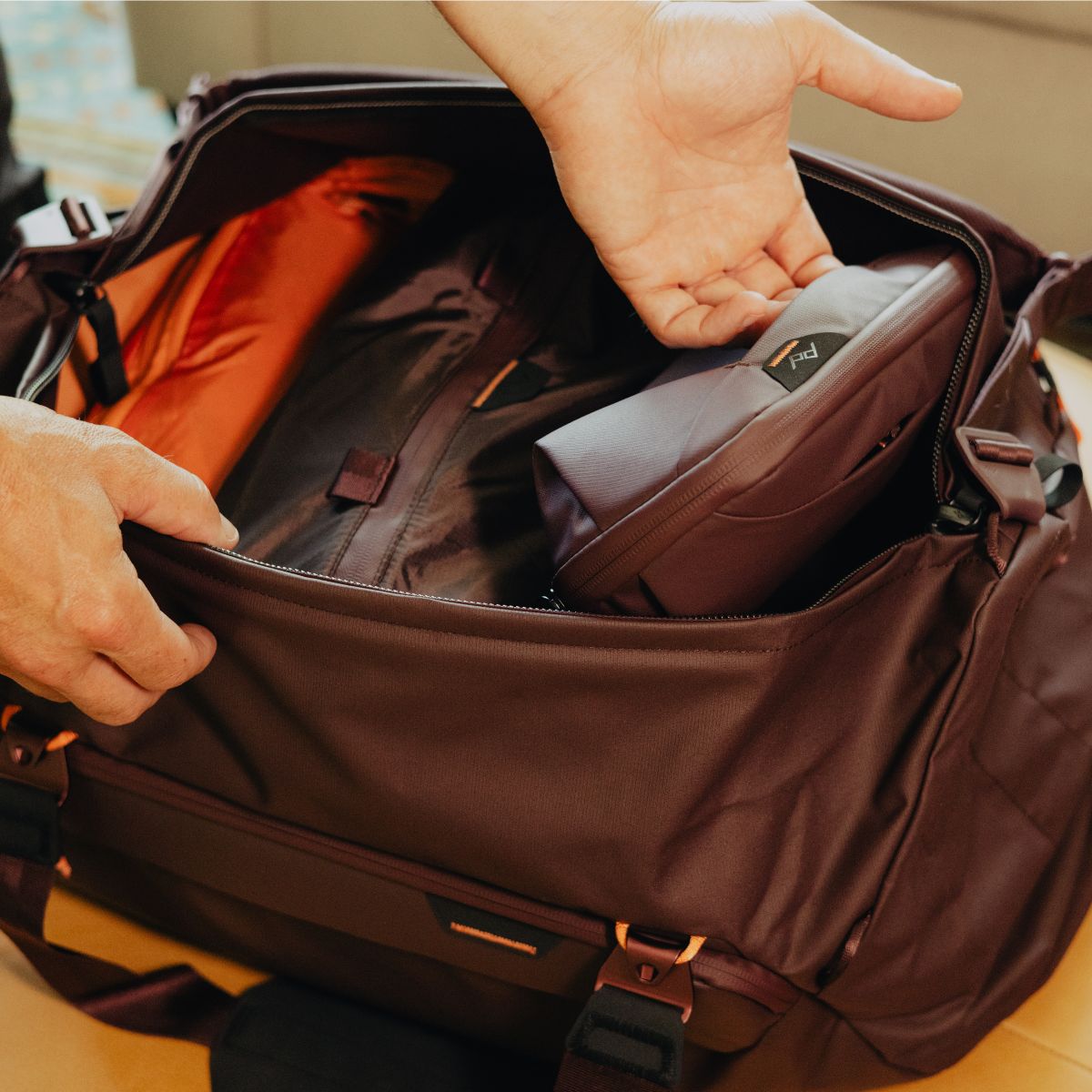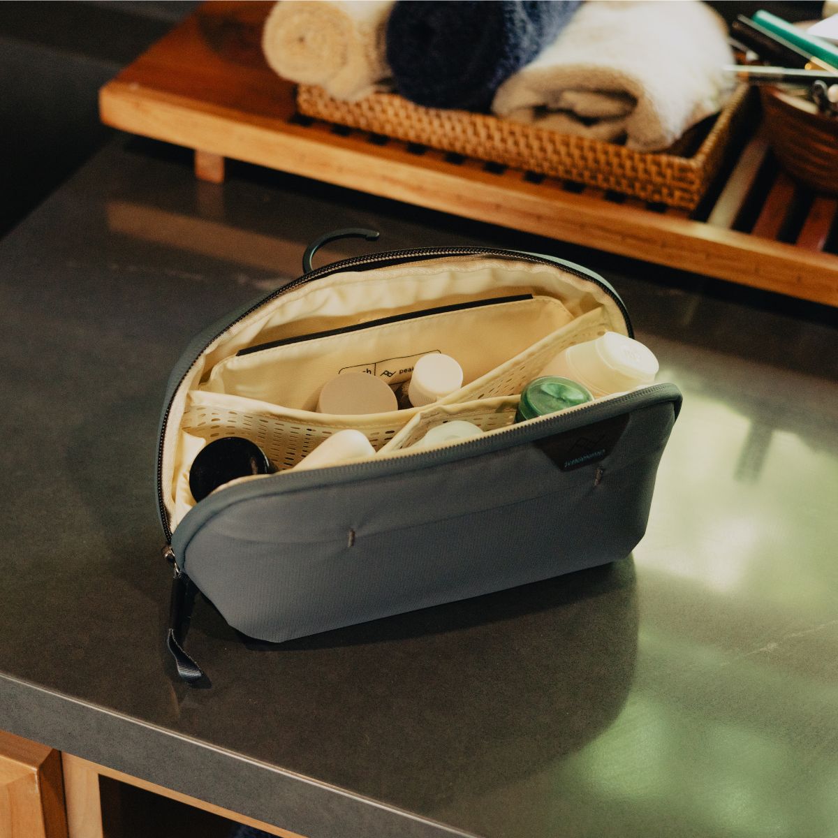 The Small Wash Pouch is designed to fit seamlessly into any travel setup. With its compact size. it sits upright when open. making it easy to access your toiletries even in cramped spaces like airplane lavatories or tiny hotel sinks. The low-profile exterior grab handle allows for quick retrieval. while the stowable aluminum hook lets you hang it conveniently. keeping your essentials off wet surfaces and within easy reach. Its minimalist footprint ensures it’s perfectly suited for travel. whether you’re packing for a quick weekend getaway or using it as a daily carry item.